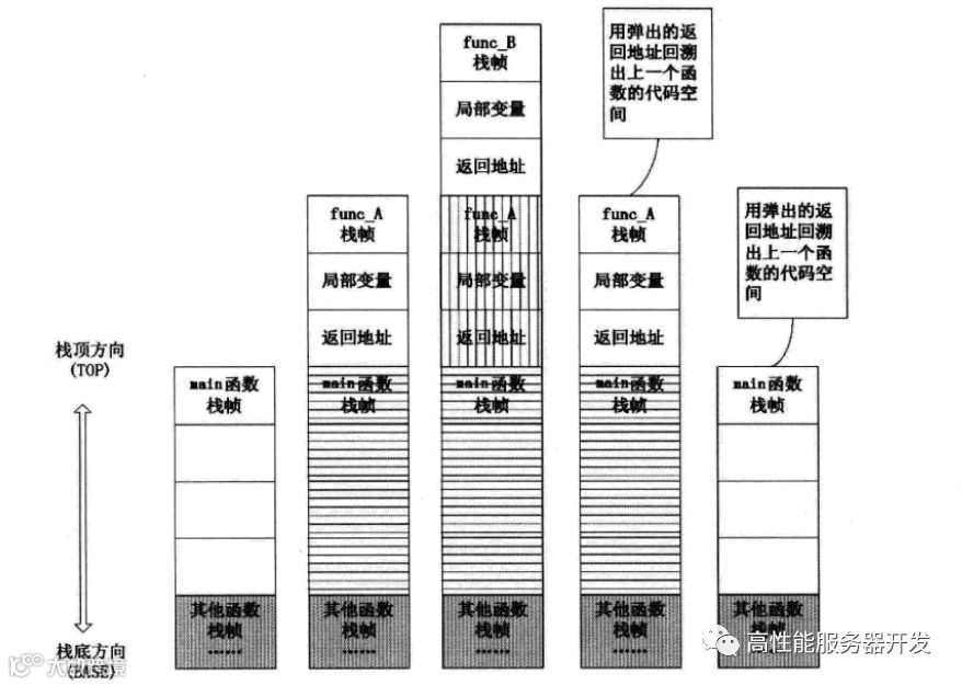 在func_B返回时,func_B的栈帧被弹出系统栈,func_A栈帧中的返回地址被“露”在栈顶,此时处理器按照这个返回地址重新跳到func_A代码区中执行。