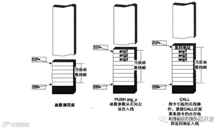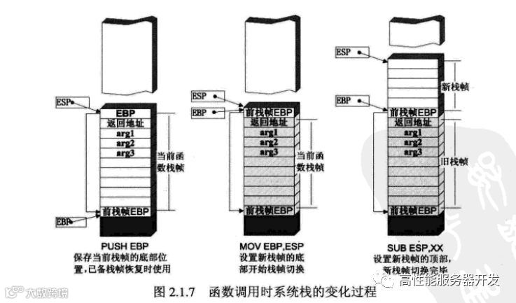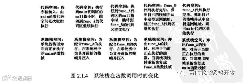 如图2.1.4所示,在函数调用的过程中,伴随的系统栈中的操作如下。