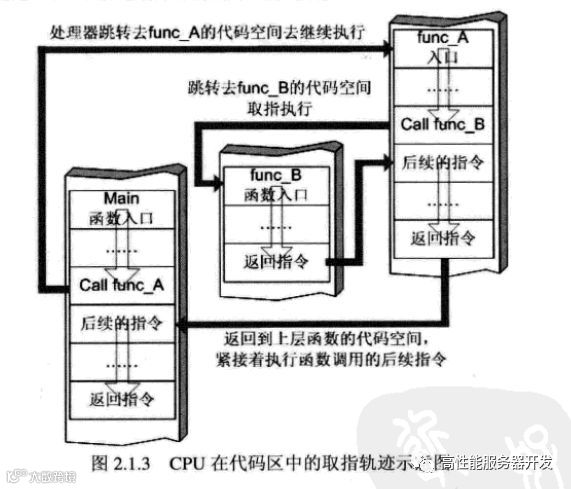 当CPU在执行调用func_A函数的时候,会从代码区中main函数对应的机器指令的区域跳转到func_A函数对应的机器指令区域,在那里取指并执行;当函数执行完闭,需要返会的时候,又会跳回到main函数对应的指令区域,紧接着调用func_A后面的指令继续执行main函数的代码。在这个过程中,CPU的取指轨迹如图2.1.3所示。