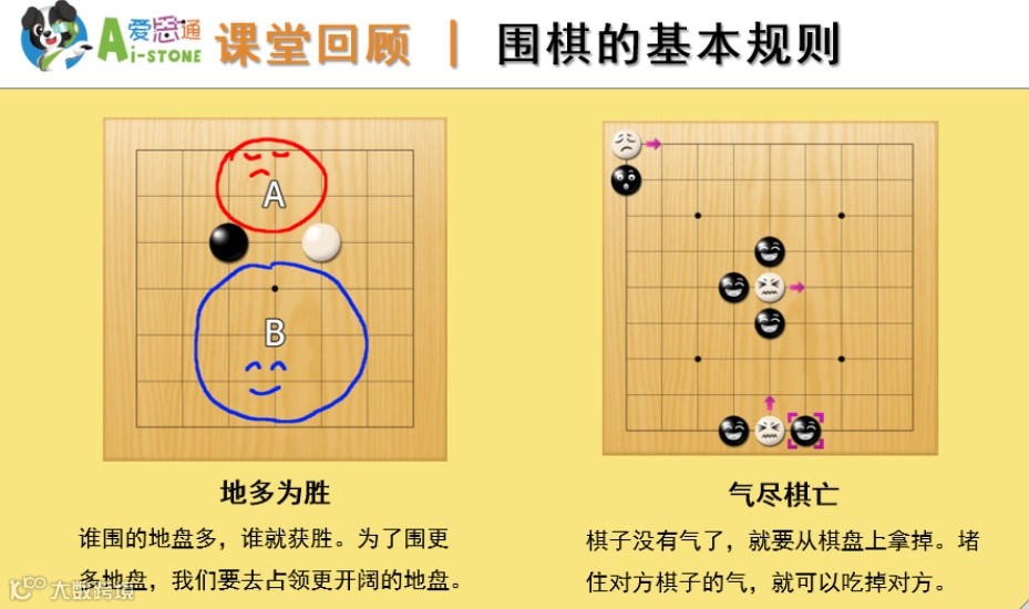 在入门时期,我们最希望孩子掌握的,是围棋的基本规则和整体逻辑:比如“地多为胜”“气尽棋亡”。这些才是围棋的根本。
