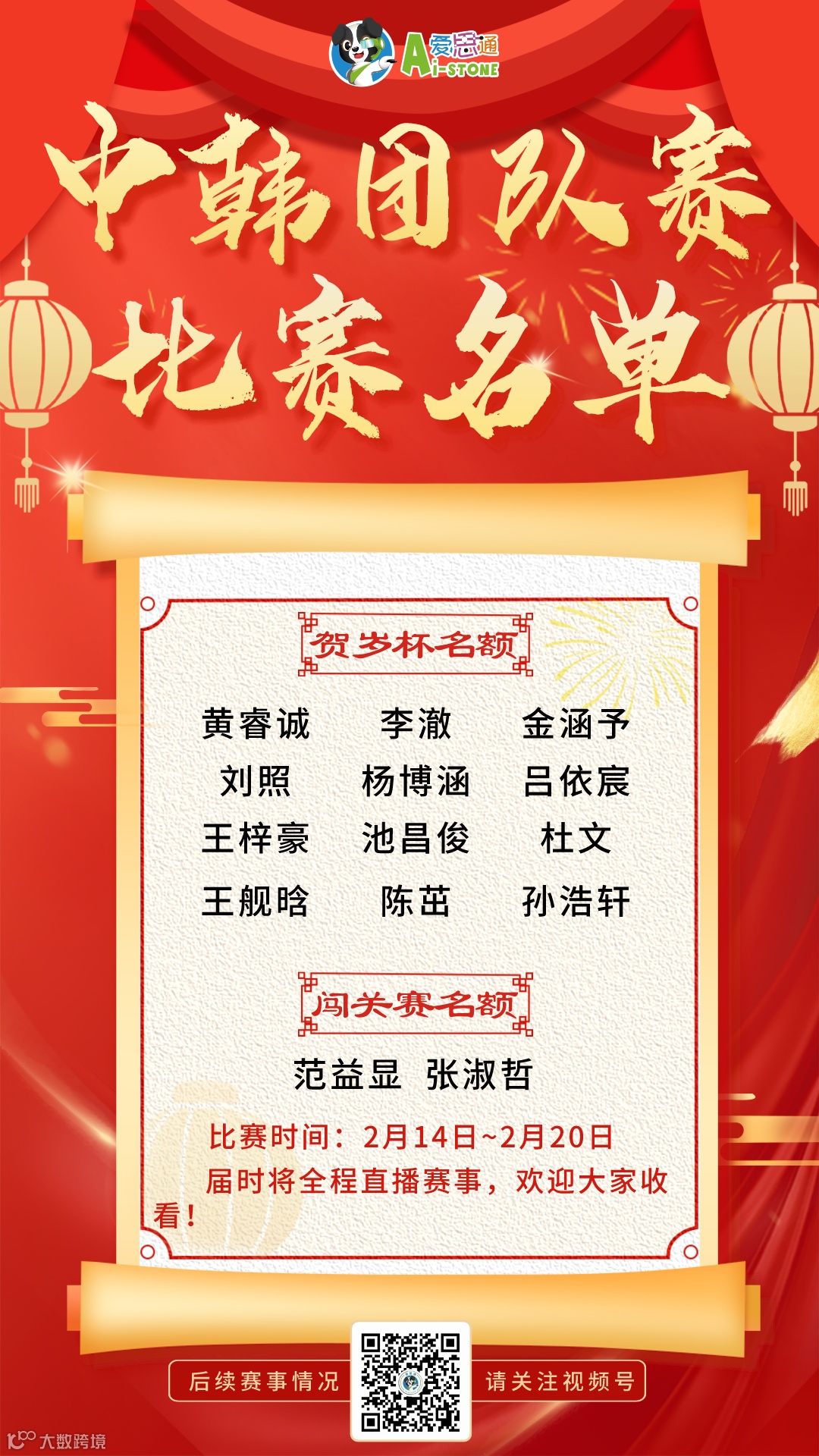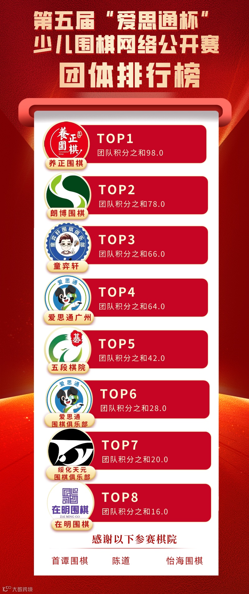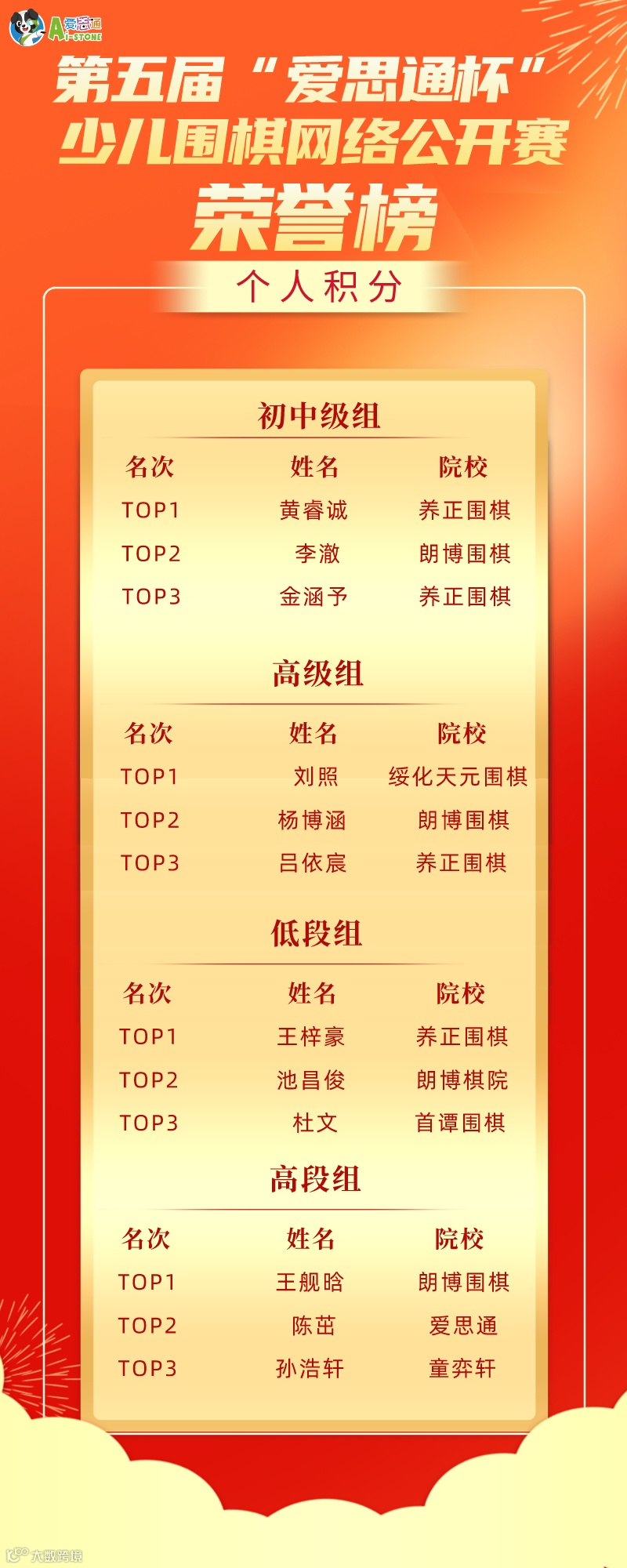 按照“爱思通杯”年度赛事规则,以上各组别的前三名以及在暑假期间荣获“爱思通杯围棋线上闯关大赛”前两名的选手,将于大年初五代表中方出战第五届中韩“爱思通杯”少儿围棋团体对抗赛。他们是: