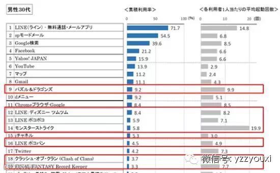 30~39岁男性午休时间使用最多的手机APP同样是LINE,累计使用率较女性略低、为71.7%,人均使用次数为14.8次。而在使用率 TOP20中手游占到了7款,依次是《智龙迷城》(第9、使用率9.2%)、《LINE迪士尼TsumuTsumu》(第12、使用率8.4%)、 《LINEPOKOPOKO》(第13、使用率5.9%)、《怪物弹珠》(第14、使用率5.8%)、《LINEPOKOPANG》(第16、使用率4.5%)、《CoC》(第18、使用率3.7%)、《FFRK》(第19、使用率3.3%)。