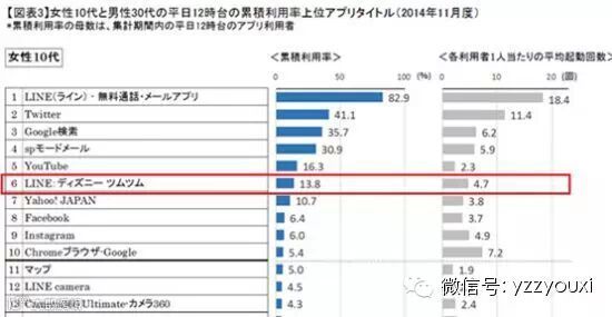 最近日本VideoResearchInteractive针对日本地区午休时人们使用最多的手机APP这一问题进行了一组调查,结果显示LINE以压倒 性的优势拿下第一,而但从手游角度上来说的话女性在午休时玩得最多的是《LINE迪士尼TsumuTsumu》,而男性这边则是《智龙迷城》。