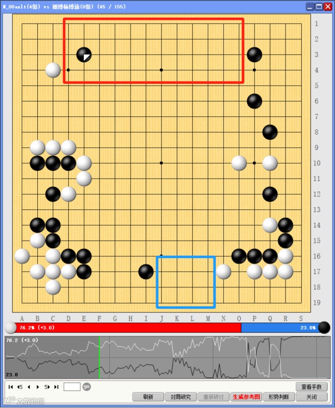 白棋在攻杀黑棋的过程,不但搭上了原本边上的领地,也错过了本可以吃住的“棋筋”(红圈位置)。