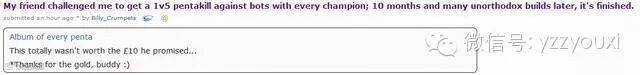 结果这位大兄弟为了完成赌约花了十个月的时间完成了这一约定,得到了来自他好兄弟的10英镑的“奖励”。话说这十个月期间还新出了好几个英雄,算不算为赌约增加了工作量了呢?