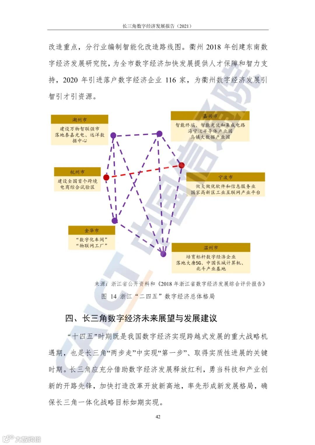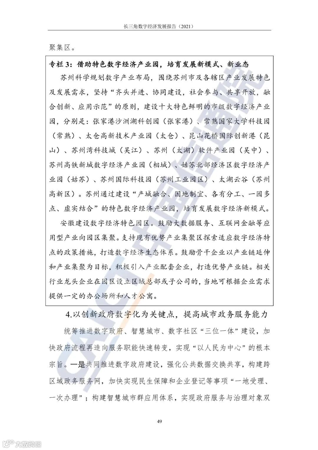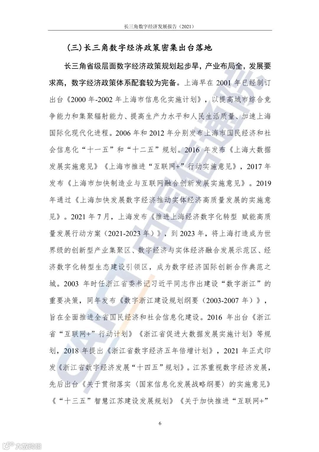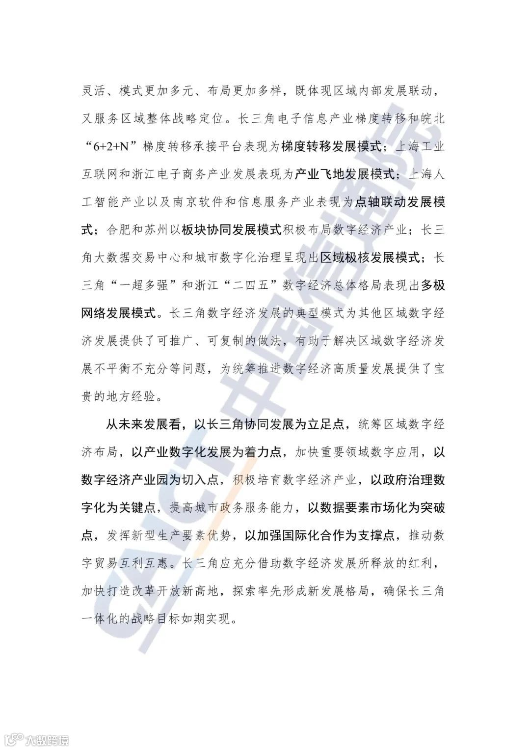 从未来发展看,以长三角协同发展为立足点,统筹区域数字经济布局,以产业数字化发展为着力点,加快重要领域数字应用,以数字经济产业园为切入点,积极培育数字经济产业,以政府治理数字化为关键点,提高城市政务服务能力,以数据要素市场化为突破点,发挥新型生产要素优势,以加强国际化合作为支撑点,推动数字贸易互利互惠。长三角应充分借助数字经济发展所释放的红利,加快打造改革开放新高地,探索率先形成新发展格局,确保长三角一体化战略目标如期实现。
