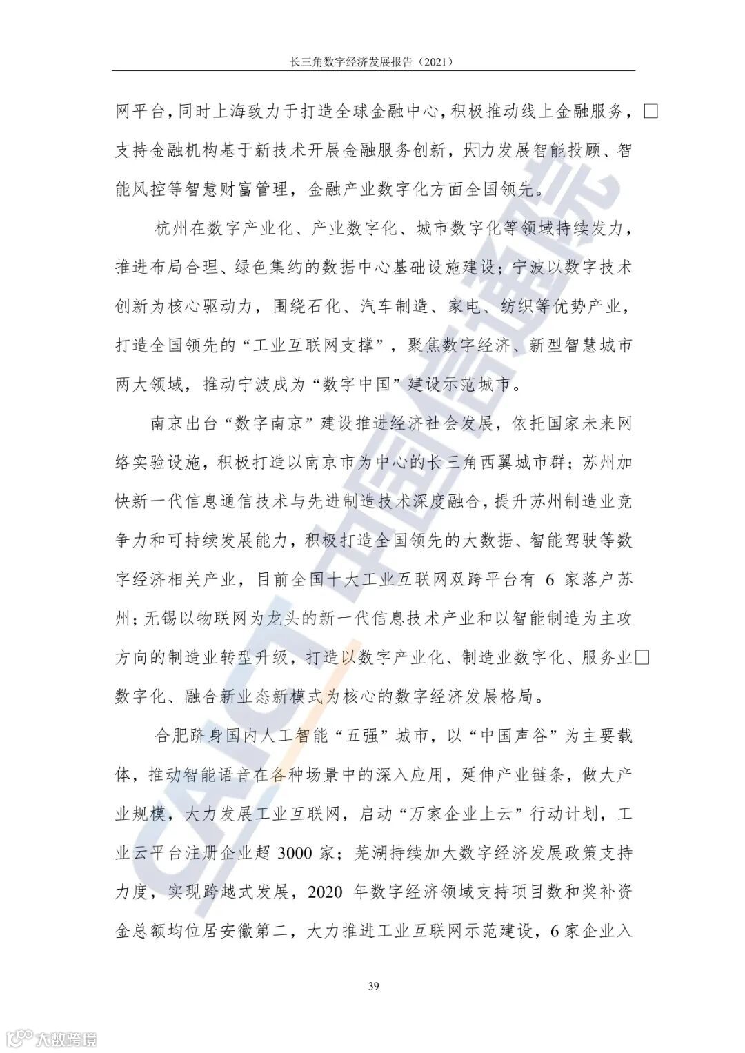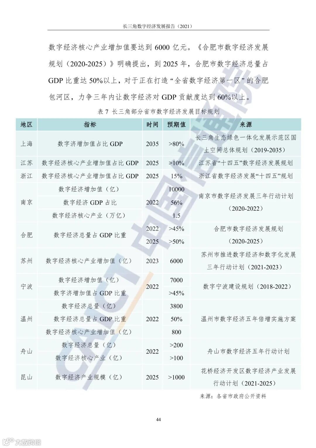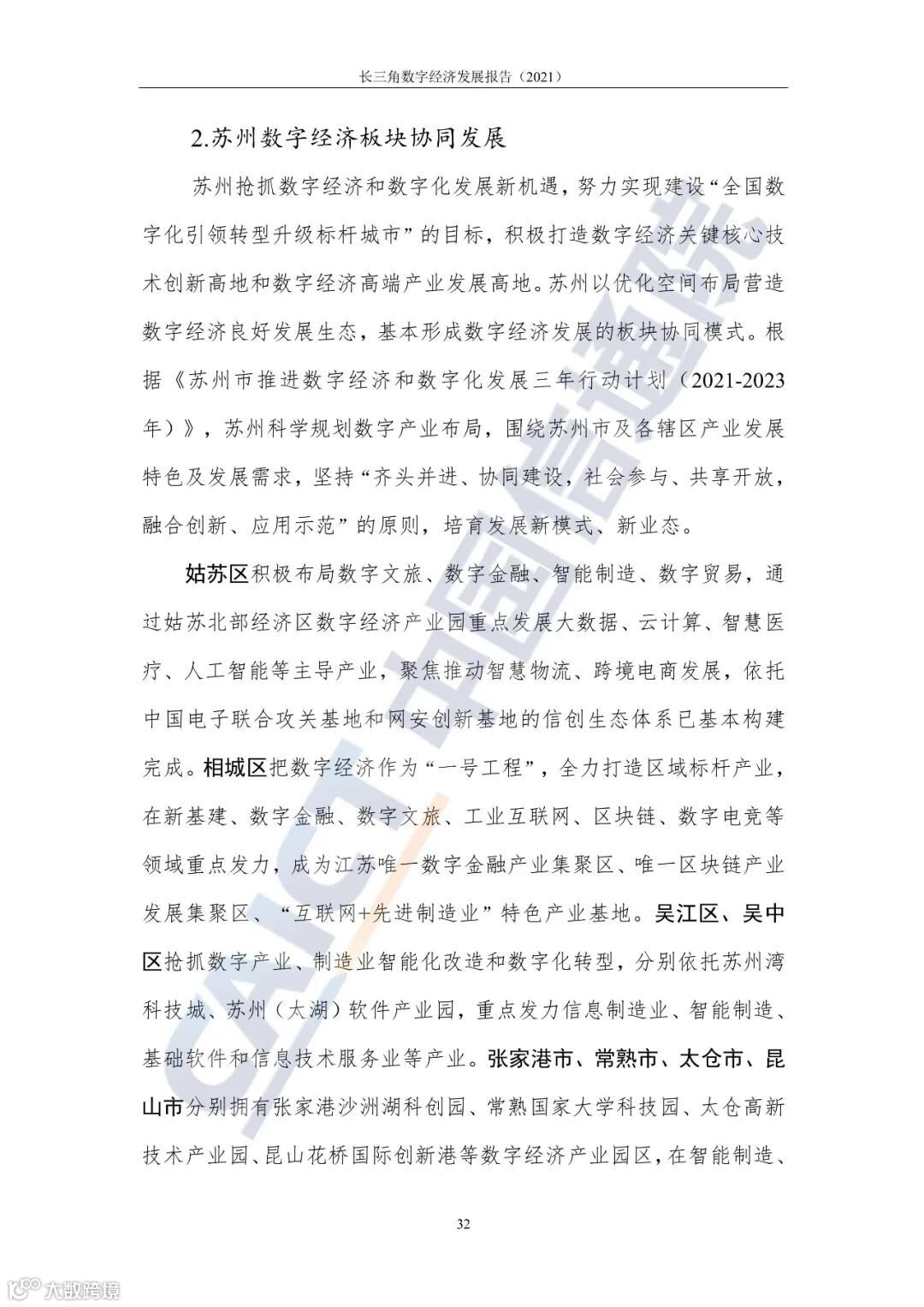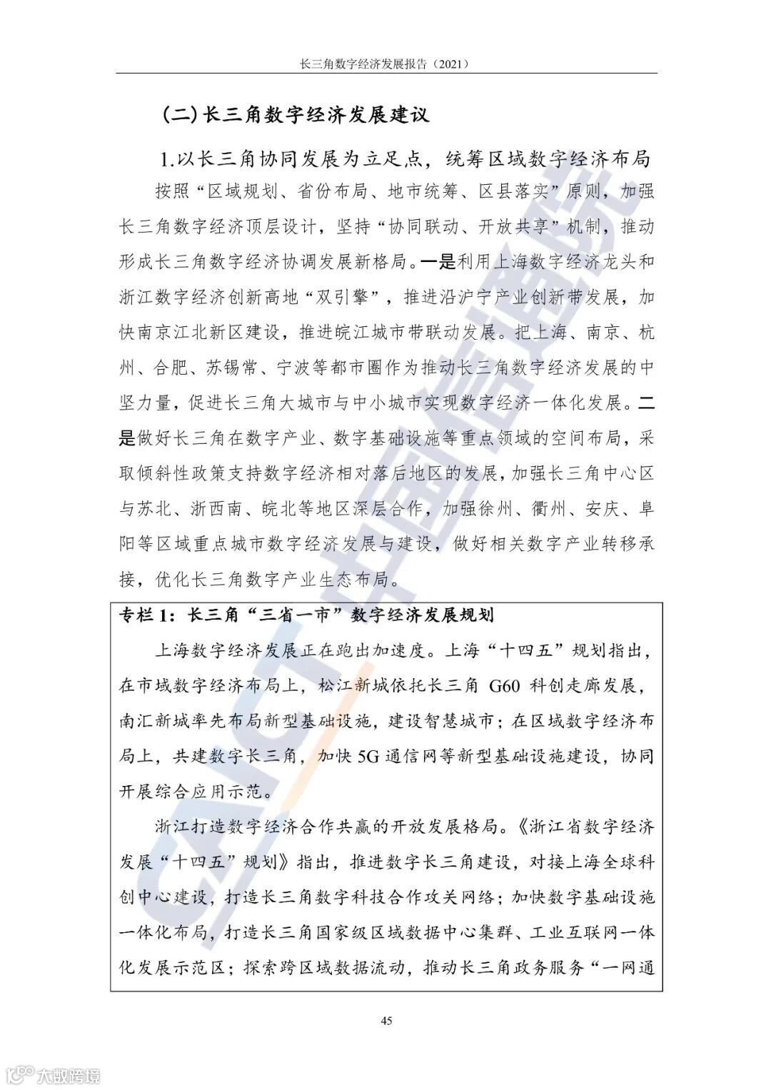从未来发展看,以长三角协同发展为立足点,统筹区域数字经济布局,以产业数字化发展为着力点,加快重要领域数字应用,以数字经济产业园为切入点,积极培育数字经济产业,以政府治理数字化为关键点,提高城市政务服务能力,以数据要素市场化为突破点,发挥新型生产要素优势,以加强国际化合作为支撑点,推动数字贸易互利互惠。长三角应充分借助数字经济发展所释放的红利,加快打造改革开放新高地,探索率先形成新发展格局,确保长三角一体化战略目标如期实现。