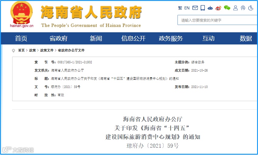 11月10日,链向科技从海南省人民政府官网了解到,海南省人民政府办公厅近日印发《海南省“十四五”建设国际旅游消费中心规划》(以下称“规划),目标到2025年,国际旅游消费中心基本建成。消费供给侧结构性改革成效显著,消费进一步提质扩容,消费型经济迈上新台阶,消费在稳增长、促改革、调结构、惠民生中的作用显著增强。免税购物、国际医疗、留学海南三大品牌建设加快推进,到2025年,吸引境外就医回流50万人次,吸引国际教育消费300亿元、回流5万人,离岛免税品贸易实现倍增。