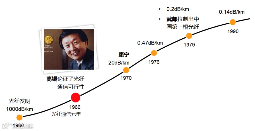 既然提到数据“运力”,就不得不提全光网。1966年,华人高锟提出了光纤传输理论,1976年,光纤技术的持续发展,使得光纤损耗已减小至0.47dB/km,推动了光传送技术的蓬勃发展,广泛应用于数据传输。