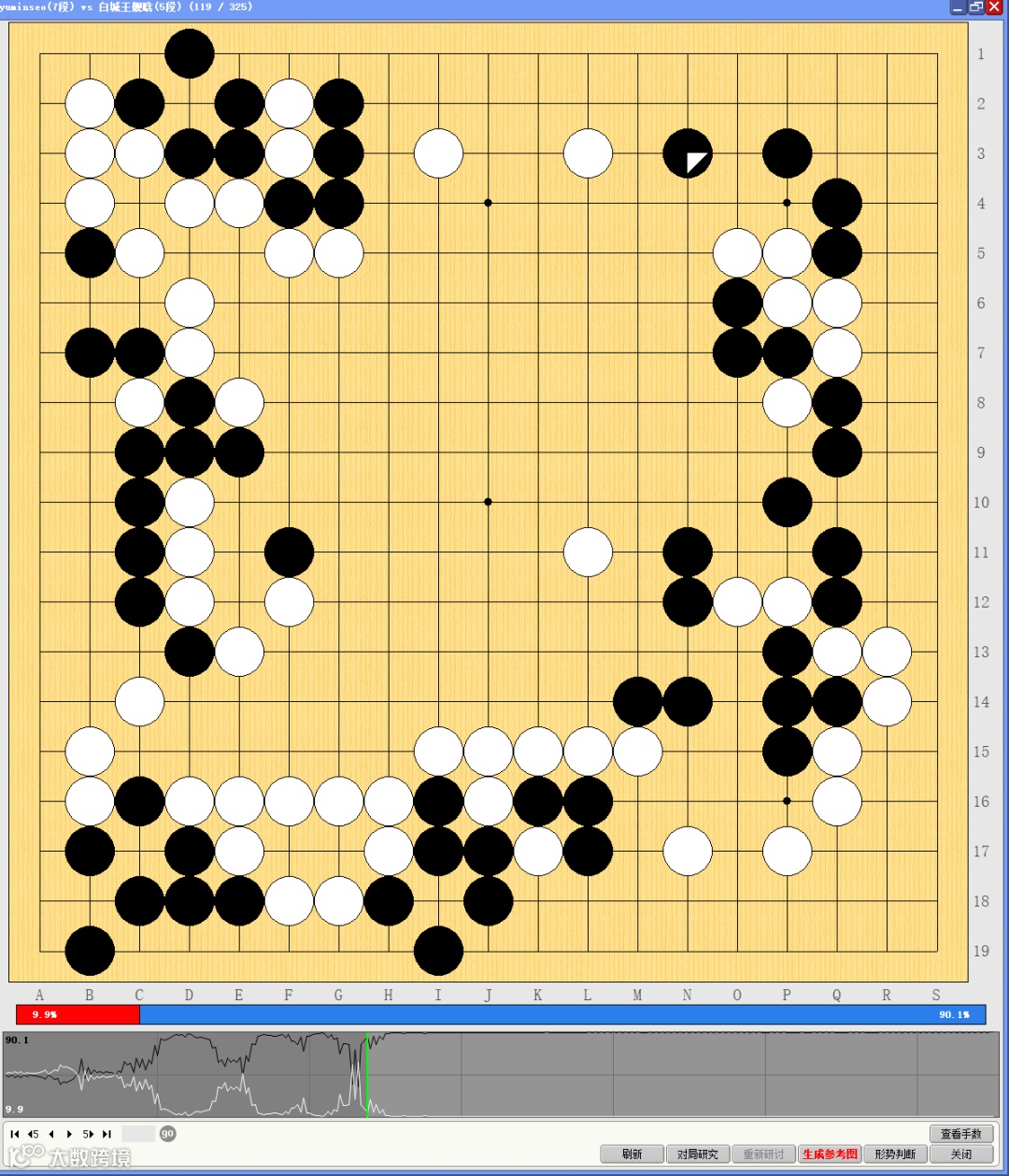 实战双方差距不大,白棋还有过逆转的机会,当右上角白棋产生弱棋,寻求出头的时候,黑棋却落子在千里之外,想要凿开白棋的铜墙铁壁。白棋根本无需理会没有发展潜力的厚势,只要照顾好上方的弱子,随着强弱的交换,形势也发生逆转。