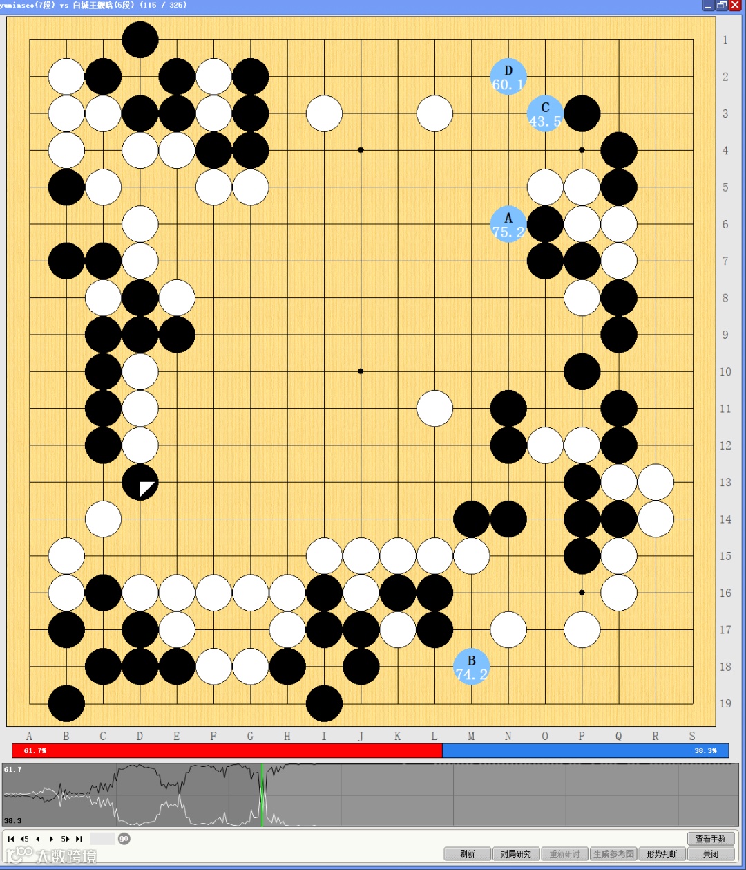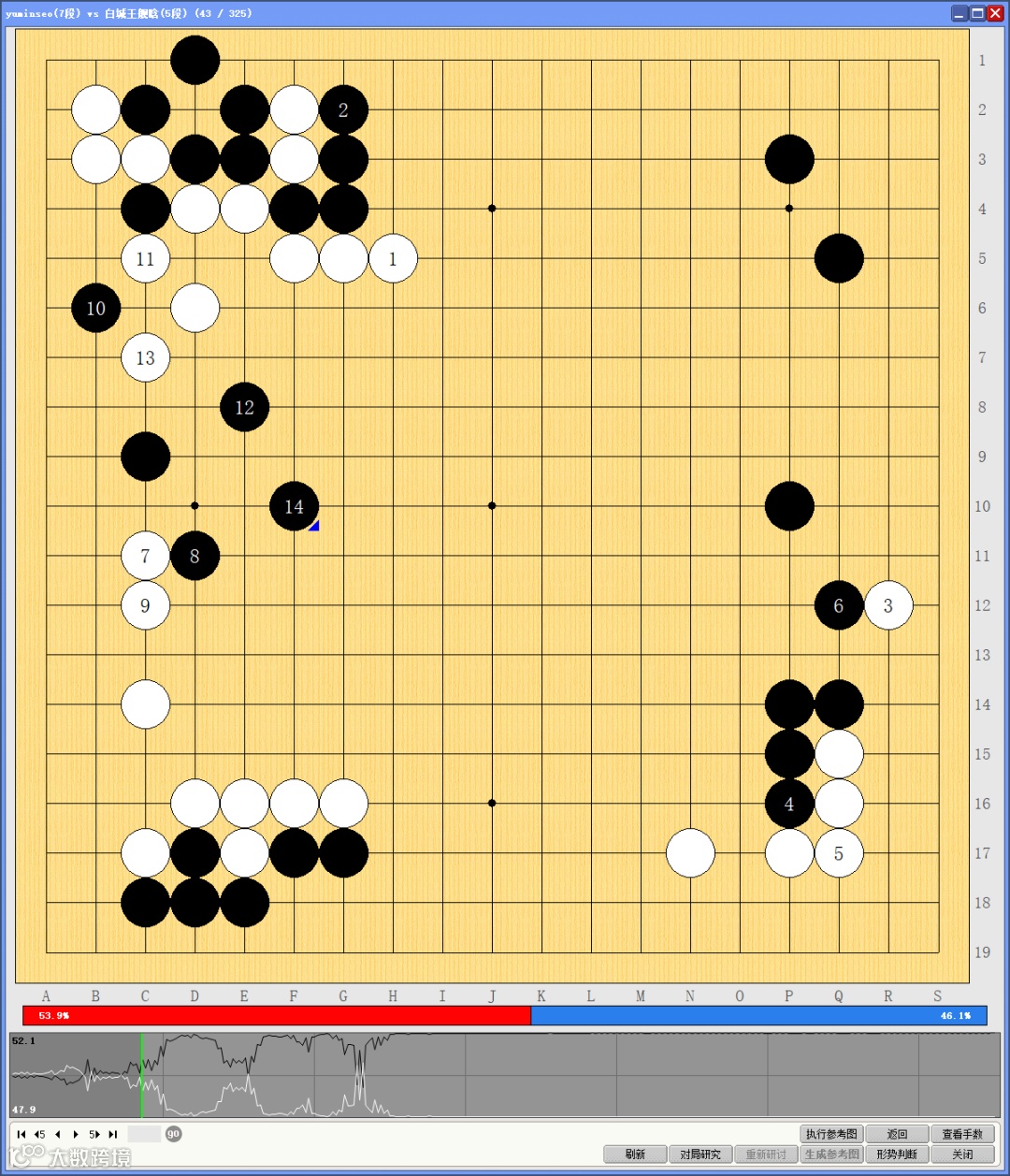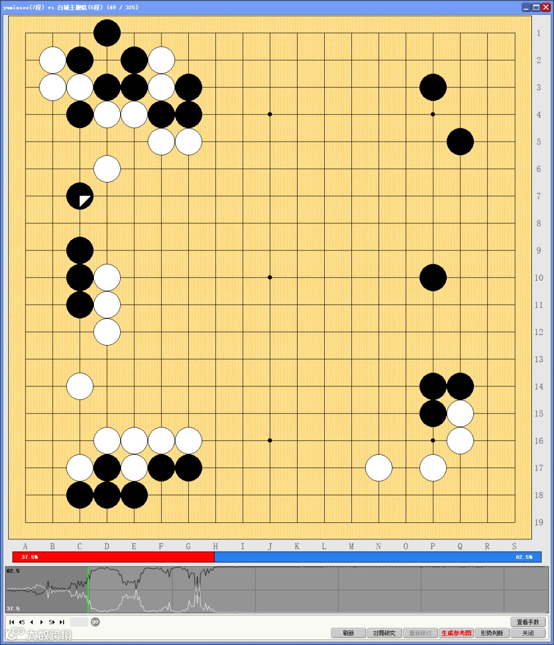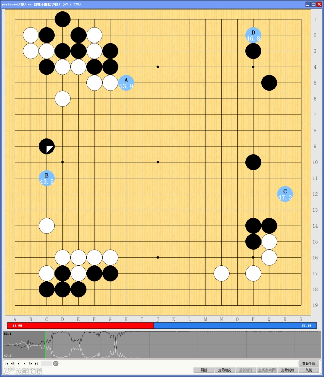 白40分断黑棋严厉,黑棋陷入被动,黑47软弱,白棋右边有断点,始终存在缺陷,不敢发力攻击。