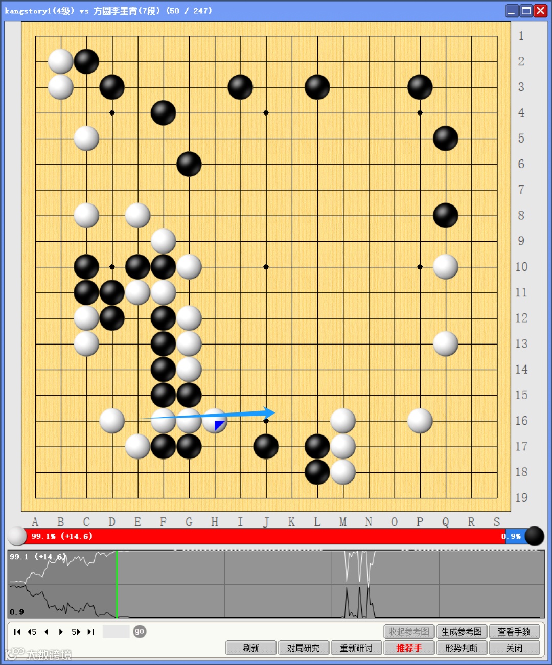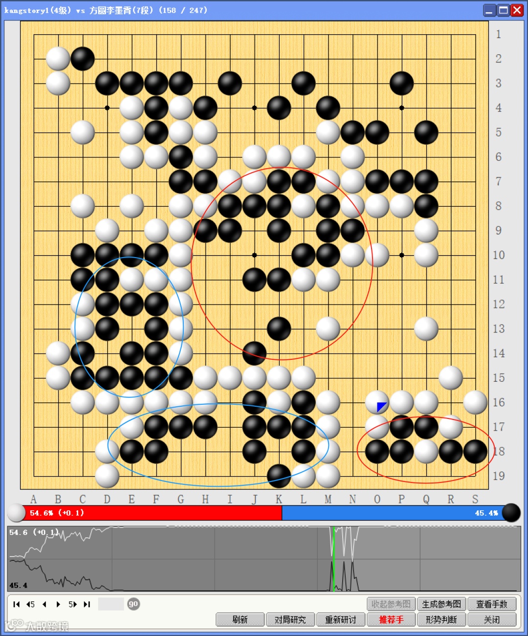 黑棋扛住劣势压力,先处理好了两处蓝圈的弱棋,同时积极入侵白棋领地,分别在中央和右下角的红圈地带成功做活……双方局势一度回到同一起跑线。可惜收官能力,白棋更胜一筹,有惊无险拿下对局。