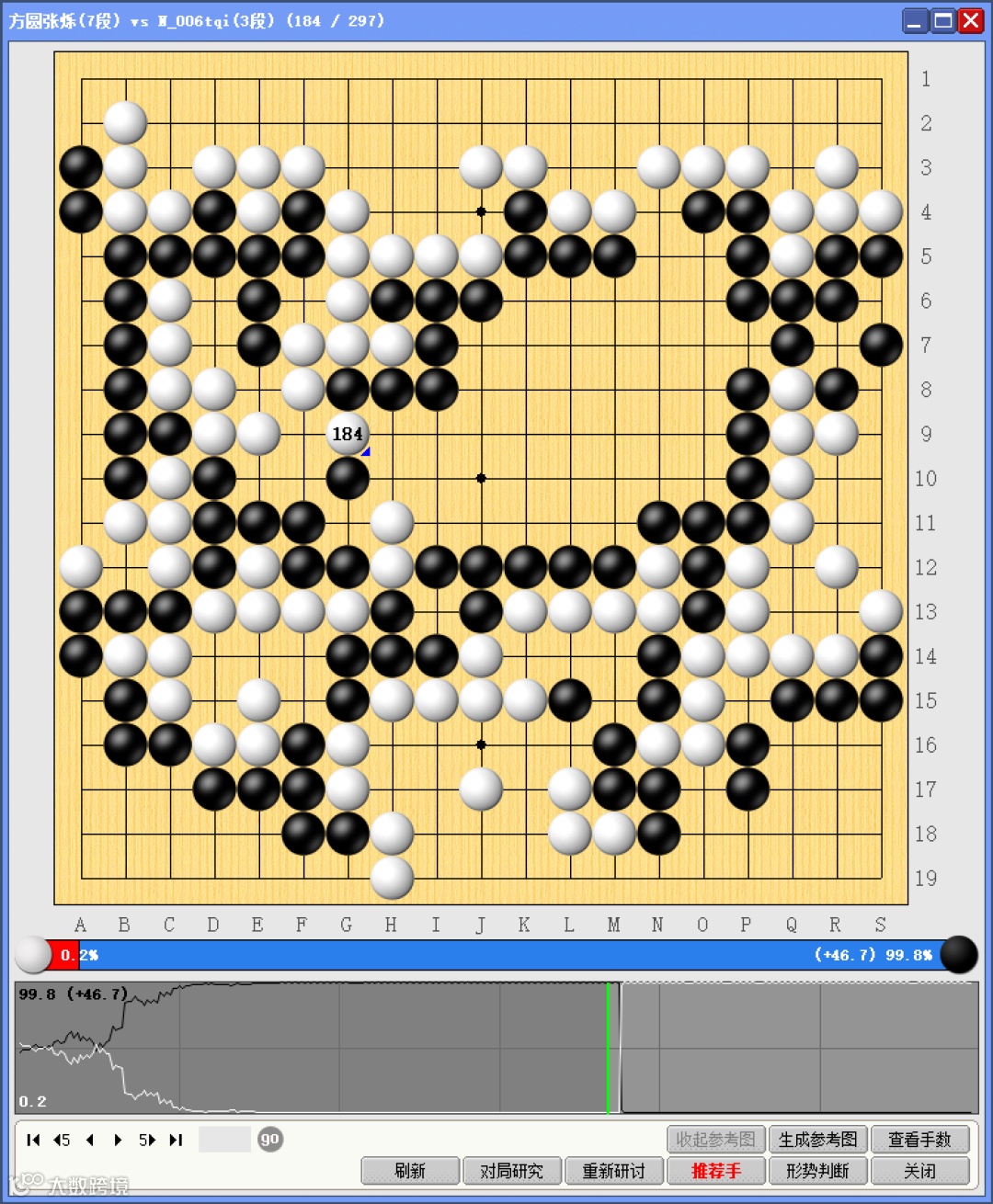 中方小棋手(白棋)面对巨大的劣势,并未选择放弃,而是在棋盘各处积极寻找机会,经历过百手的交战,均为黑棋稳定应对……直至第184手,中方小棋手用“挖”,尝试分断黑棋,对韩方小棋手发起考验。