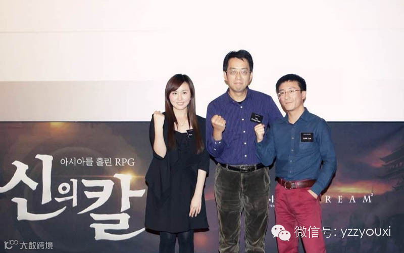 《新仙剑》骏梦游戏副总裁翁瑞泽、仙剑之父姚壮宪、海外运营总监罗聪合影