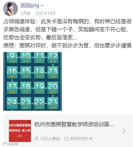 2020年2月27日—3月29日,中国棋院杭州分院组织了杭州市第三期围棋智慧教学师资培训,全市来自中小学、幼儿园即其他围棋机构共413名围棋教师以及部分围棋学员家长参加了本期师训。受疫情影响,本期师训改变了过去两期线上+线下的基本模式,由资深人工智能围棋智慧教学导师简超5段全程线上授课,并依照闯关任务、打卡、线上测试三个标准分两个阶段进行了严格考核。