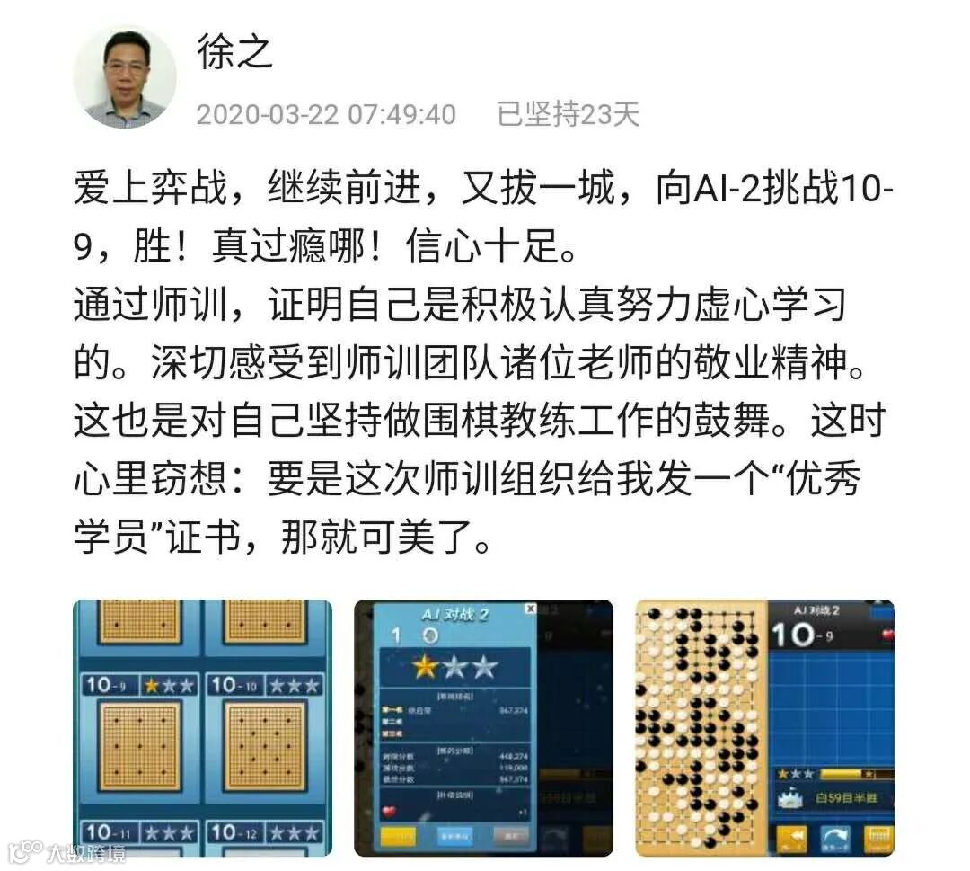 3月22日晚八点,参加本次集训的一班、二班围棋教师在弈战人工智能围棋平台结束了全部考核任务。第一阶段参加考核教师通过率85.5%,第二阶段考核通过率92.9%。通过第二阶段考核的教师获得“杭州市棋类教练员证书”与“杭州市围棋执教证”。