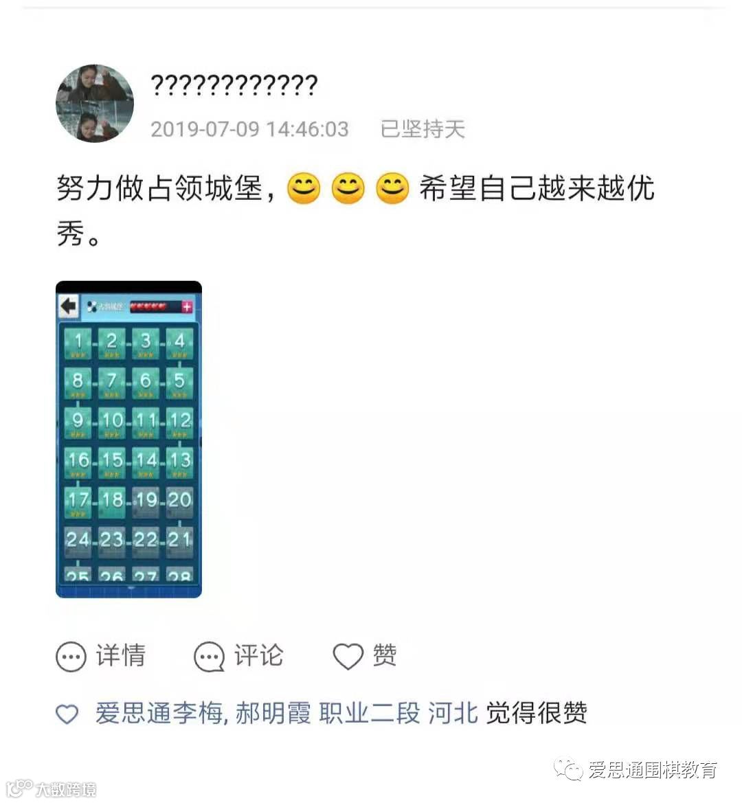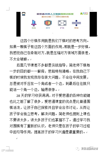 上完训练营第2期课程之后,周天惠感觉对围棋又有了一个深入的了解,爱思通人工智能棋盘比普通的棋盘更好玩,上课内容更加灵活:让孩子们自由探索、合作讨论共同进步,从而让孩子学会独立思考,培养遇到问题时解决问题的能力。