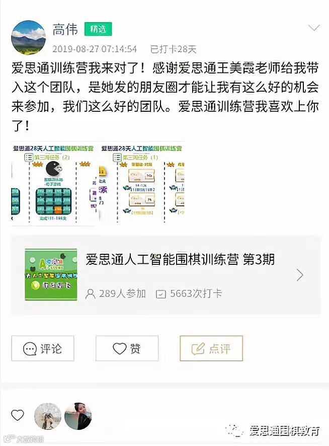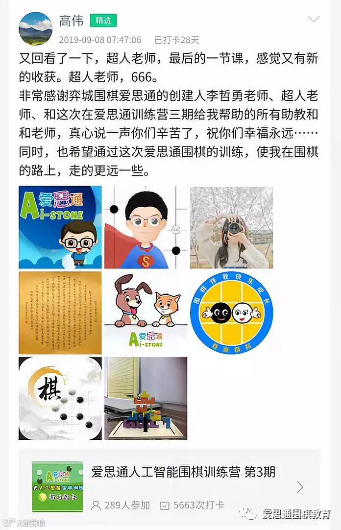 高伟在爱思通王美霞的朋友圈看到了爱思通训练营三期的活动,他毫不犹豫的报了名。在28天的这段期间学习,主讲超人老师课程非常生动,为了完成超人老师的作业,得到超人老师所许下的奖励,还想提升自己棋力,拥有很大的学习动力。
