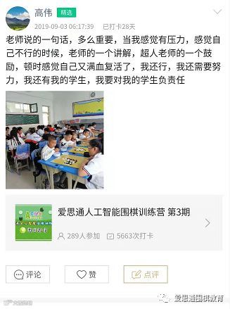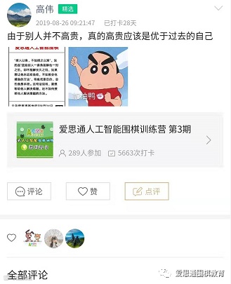 在这期间高伟更大的收获是认识了好多的围棋老师,虽然没有正面接触,但是在打卡中看到,各位老师留下的格言,感到莫名的亲切,写的都太好了!只要有意义的都会保存起来,在没事的时候拿出来看看,丰富一下头脑。
