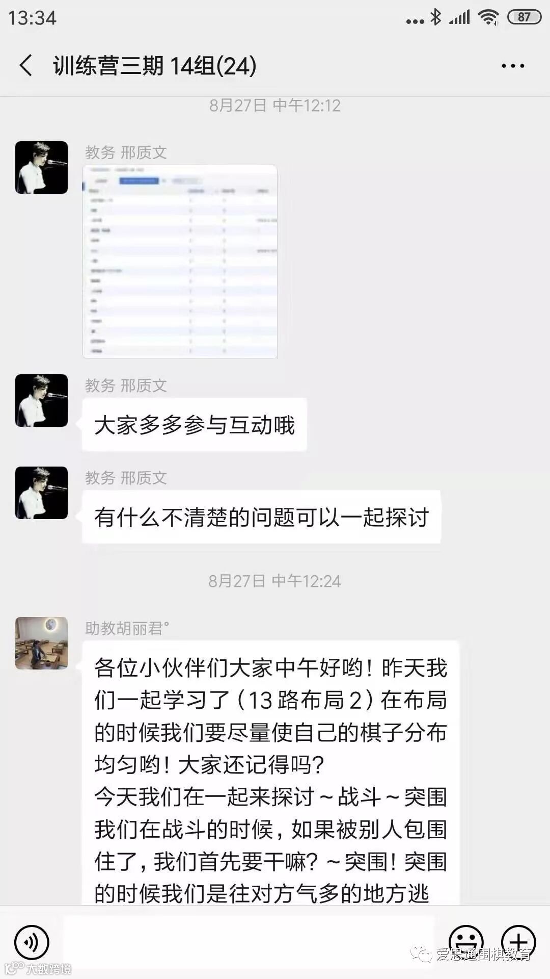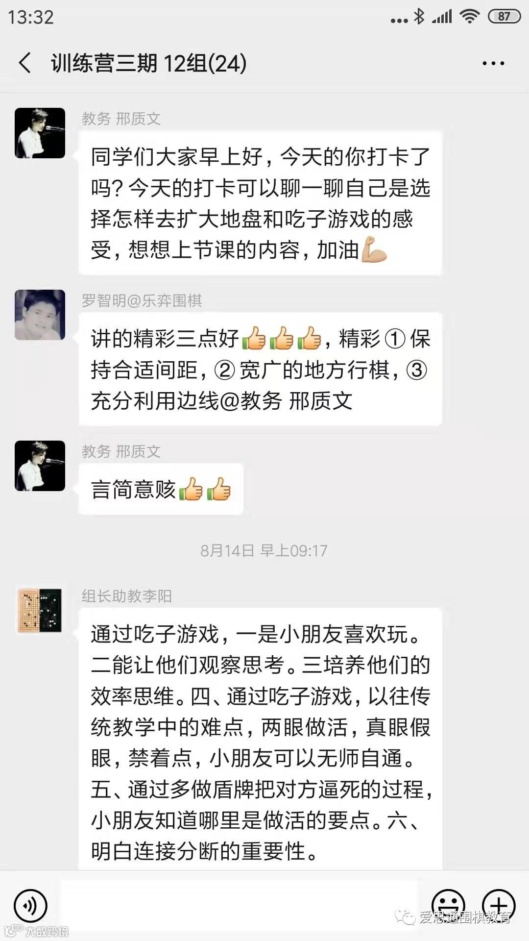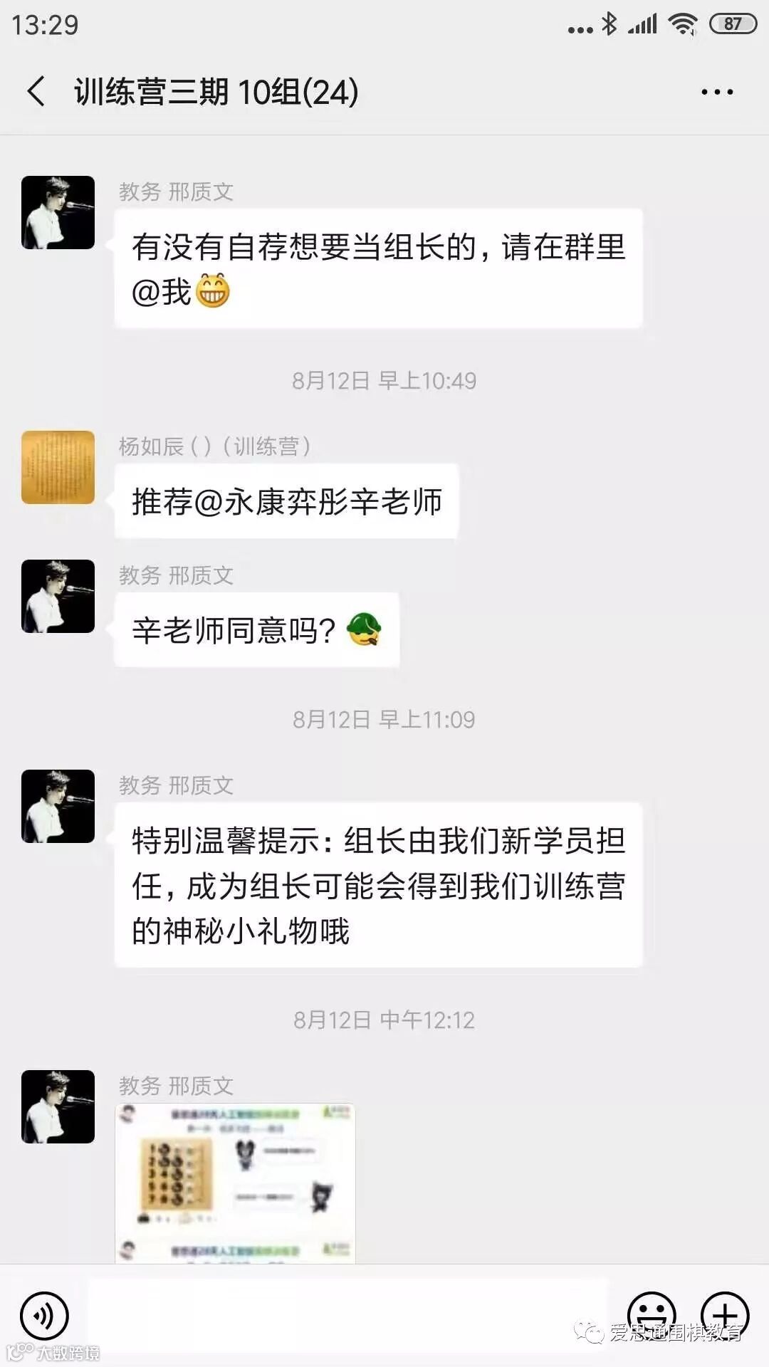 在三期训练营中邢质文辛勤付出,在团队中学到了很多东西。在这个充满爱的环境中,前辈们的鼓励成为他围棋教育这条路上的一道光芒,指引他不断前行。
