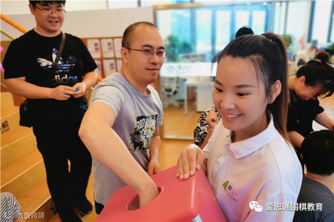 棋局结束后,在宋老师的带领下家长与小朋友进行了亲子答题活动,规则是家长随机从抽题箱 中为自己的孩子抽取一道爱思通里面的题目,并且与孩子一起在规定时间内完成题目,完全正确就会得到相应奖励,这个环节受到了家长和小朋友们的喜爱,现场气氛一度十分火爆。