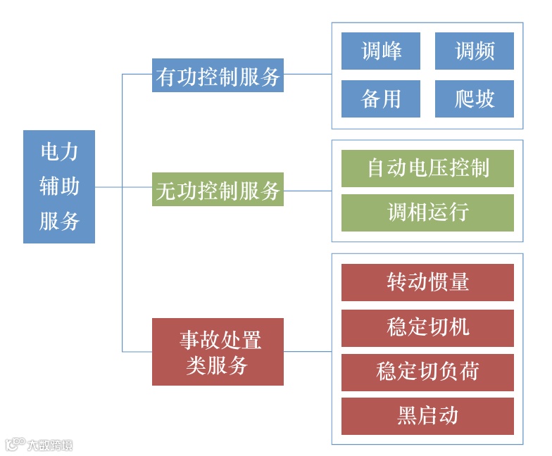 从功能的角度区分,电力辅助服务主要分为有功平衡服务、无功平衡服务、事故恢复服务三类。有功平衡服务主要包括一次调频、二次调频、备用等。调峰作为一种特殊的有功平衡服务,在电力现货市场尚未建立的背景下,可视同辅助服务。无功平衡服务主要为无功调节、电压支撑。事故恢复服务主要是指黑启动。实践中大多数电力辅助服务市场中的辅助服务交易品种主要有负荷跟踪与频率控制(AGC)、备用、无功电压支持、事故恢复服务(黑启动)、爬坡、转动惯量。