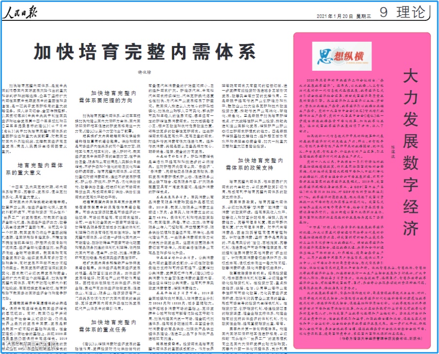 2021年1月20日,人民日报第9版刊发《大力发展数字经济》文章,作者为清华大学经济管理学院党委书记、副院长陈煜波。文章指出,数字经济已成为引领全球经济社会变革、推动我国经济高质量发展的重要引擎。