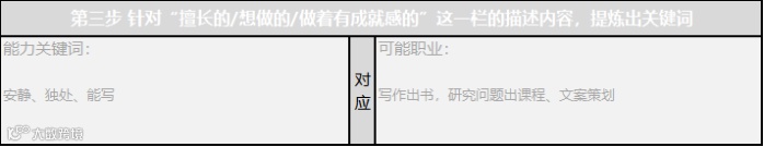 比如:安静、独处、能写,这三个关键词,可以推断出,适合的职业有:写作出书,研究课题,文案策划,软文营销等等,这些职业。
