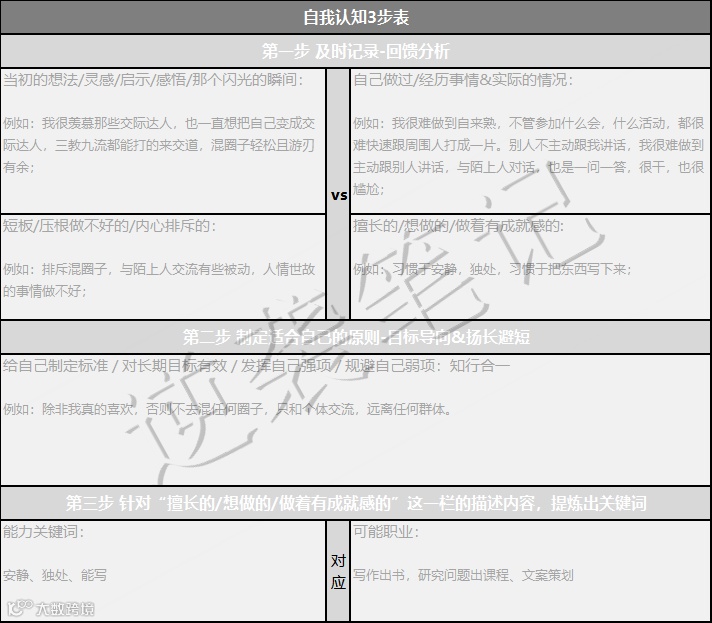 做过、经历过的事情,实际情况都记录下来。通过这些真实发生的事件,分析出自己的短板不足和内心排斥的事情,分析出擅长想做,做着有成就感的事情。