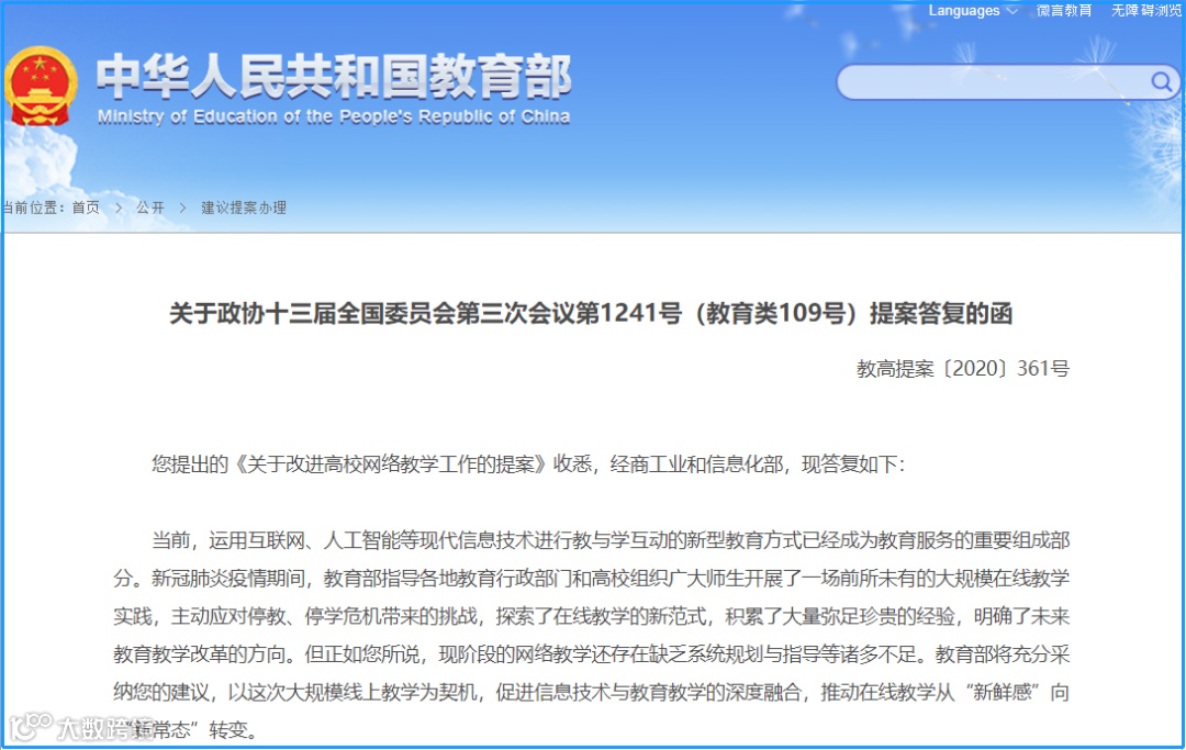 近日,教育部官方网站发布《关于政协十三届全国委员会第三次会议第1241号(教育类109号)提案答复的函》,其中提到运用互联网等现代信息技术进行教与学互动的新型教育方式已经成为教育服务的重要组成部分,教育部将加强大容量智能教学资源建设,加快建设在线智能教室、智能实验室、虚拟工厂(医院)等智能学习空间,积极探索基于区块链等新技术的智能学习效果记录、转移、交换、认证等有效方式,形成泛在化、智能化学习体系,推进信息技术和智能技术深度融入教学全过程,打造教育发展国际竞争新增长极。鼓励高校校际学分互认,积极推进线上学分互认,引导学生在疫情防控期间积极选修线上优质课程,制定在线课程学习学分互认与转化政策。