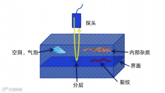 超声扫描成像设备检测纤维复合材料内部缺陷,以“声阻差异”为基础,通过收集超声波与缺陷位置和非缺陷位置发生的“反射,衰减,折射”现象,将物理信号转化为缺陷的 “位置、大小、类型” 等信息。