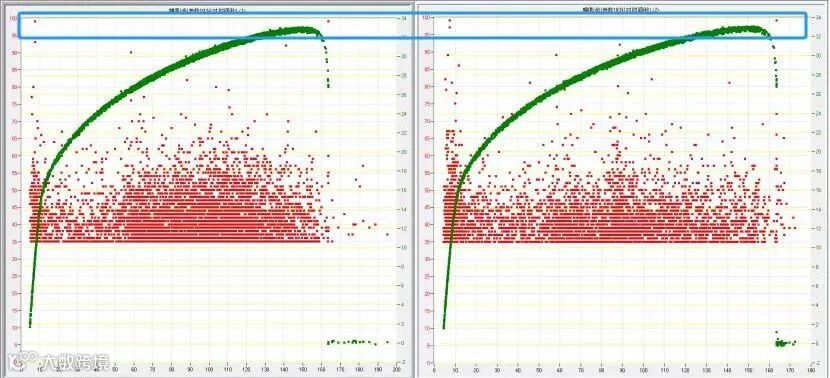观察数据界面,我们可以看到图中红点即为单个声发射信号,绿点为试验机加载载荷信号。横轴为时间,纵轴为大小。可以看到从加载开始声发射系统便成功采集了碳纤维增强复合材料内部损伤产生的声发射信号。对比载荷数据可以看到随着加载载荷不断提升声发射信号量也随之增加,这便反映了试件内部随载荷提升的而产生的损伤情况。当试件断裂时系统也成功采集到了断裂产生的高强度信号(框架内标记)。