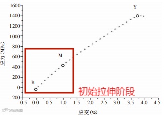上图B→M代表初始拉伸阶段,材料应变线性越大,应力越大。材料在这一阶段产生弹性变形现象,较强的整体抗变形能力使之始终维持着比较稳定的内部状态。进一步加载后