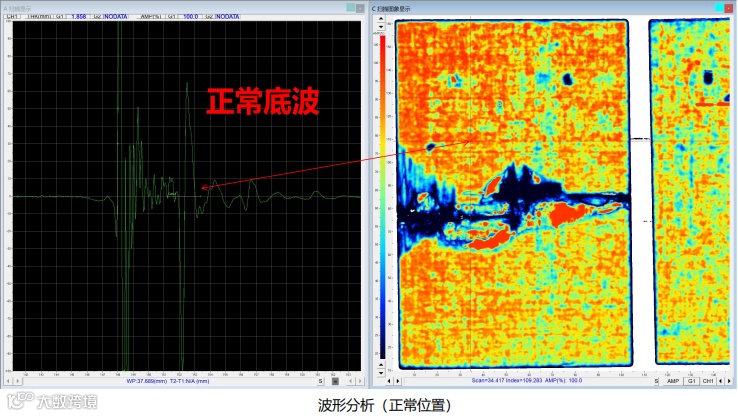 通过穿透式将工件放置两探头中间,探头对称放置在工件两侧,采用双探头穿透法的纵波检测模式,以保证超声波垂直入射到工件中,所有信号采集都是原始波形。下图为碳纤维增强复合材料检测图像
