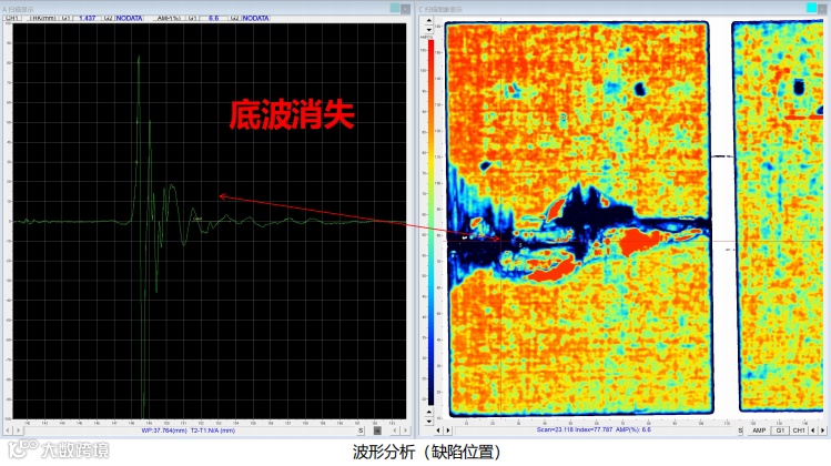 利用水浸式检测可完全填充探头和材料间表面的间隙,确保超声能量稳定传递,采声TCS-33HD水浸超声对碳纤维层压板进行检测,生成二维C扫描超声图像,可以明显看到有无缺陷对应幅值变化和缺陷位置及大小。