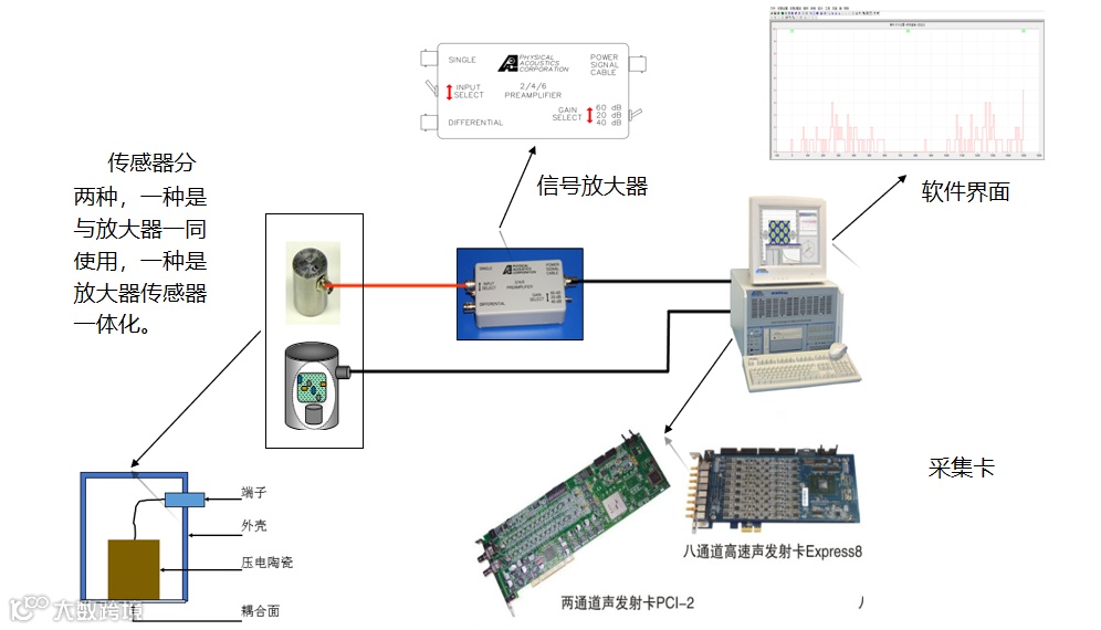 2.声发射的系统组成:声发射检测系统主要包括硬件及软件两个方面,软件是AEwin系统软件,硬件包括传感器、放大器、电缆、PCI卡、计算机等。