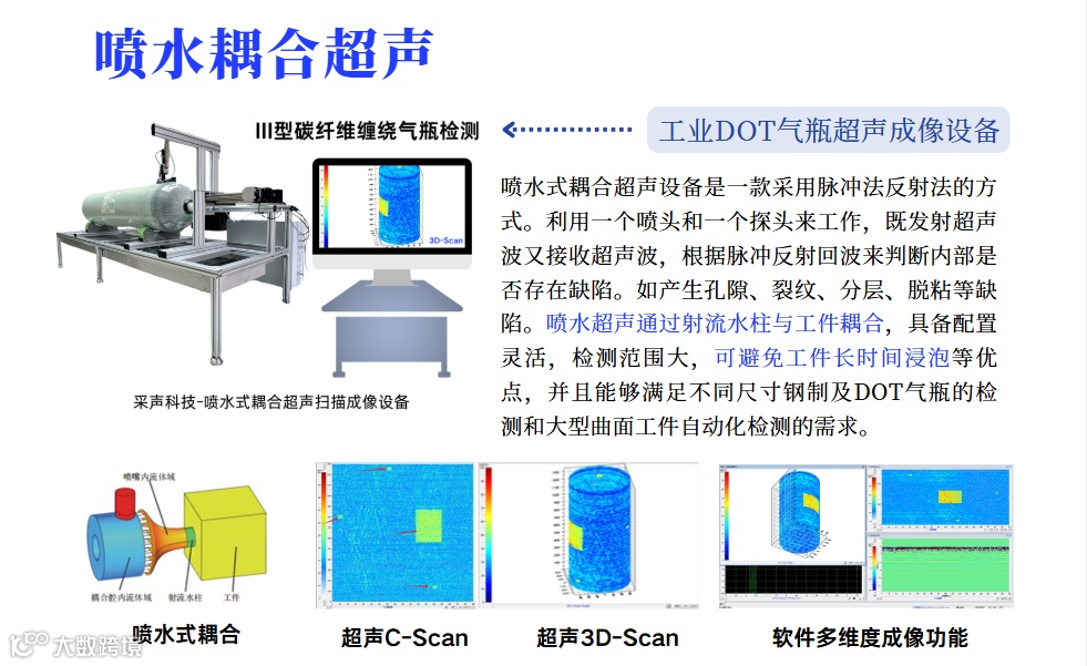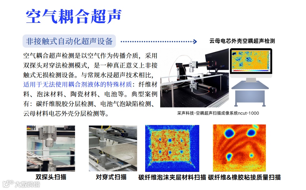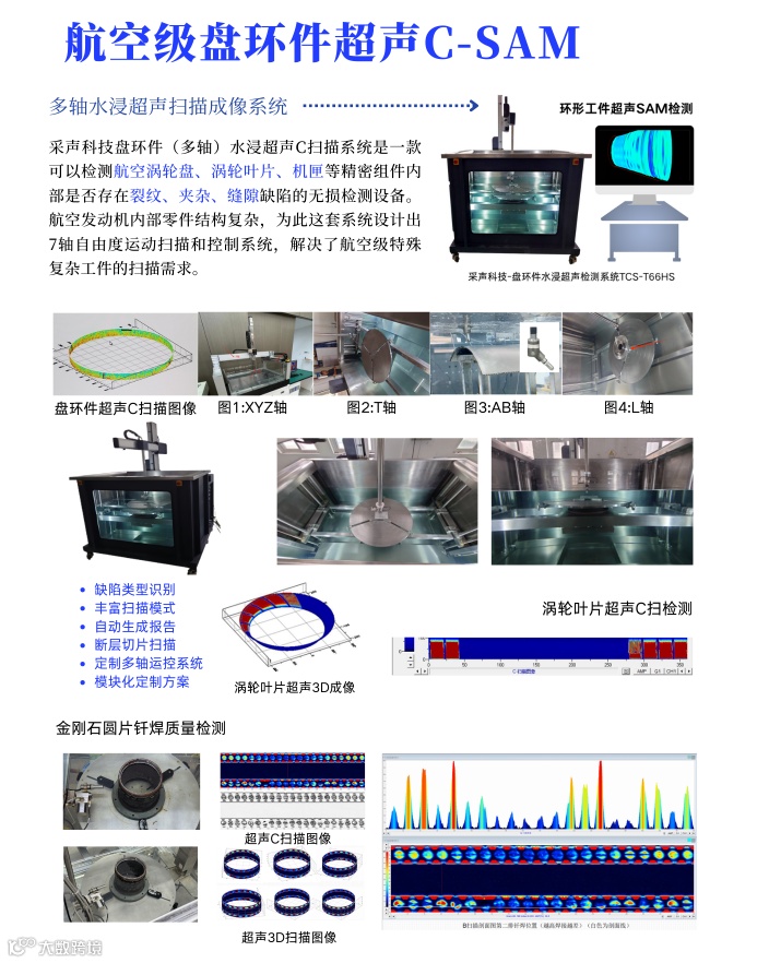 企业现有:自动化超声检测涵盖了水浸超声系统、喷水超声系统、空耦超声系统和显微超声系统;智能声发射系统涵盖了三防在线监测系统、高速高精度模态声发射系统、微型高精度双通道系统、4通道无线云平台声发射系统;应用于主机厂(航空航天)大型板棒(管)材、航材零部件、复合材料、汽车轴套、新能源电池和电子芯片封装等领域;覆盖了实验室型、工业重载型、塔式结构、机械臂结构及非标定制类型,满足无损检测行业各类标准自动化检测的需求。