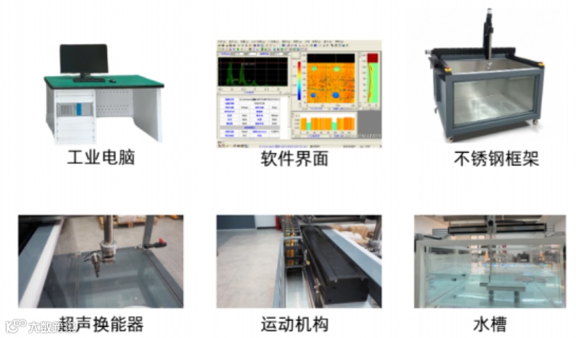 2.超声扫描显微镜组成:不锈钢框架结构、运动模组(XYZ轴)、全功能授权系统软件、安全装置、超声板卡、工业电脑、水槽、探头、水循环系统、ups电源等。