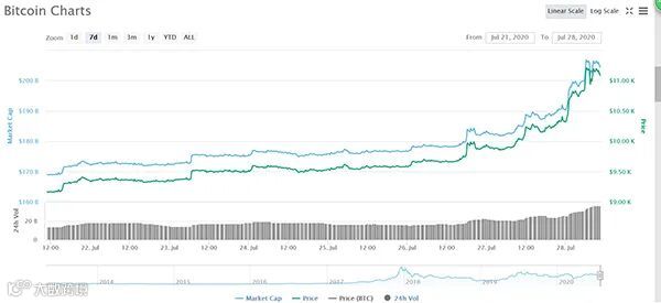 继7月26日涨超10000美元大关后,比特币价格持续拉升,7月28日周二亚市早盘,比特币价格升破1.1万美元,创去年8月以来盘中新高,与2020年3月12日最低值4107美元相比,涨幅约166.81%。