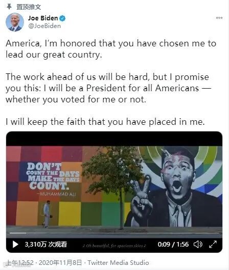 此外,拜登在推特上表示:美国,我很荣幸你选择我来领导我们伟大的国家。我们面前的工作将是艰巨的,但我向你保证:我将成为全体美国人的总统——无论你是否投了我的票。我定不辜负你们对我的信任。