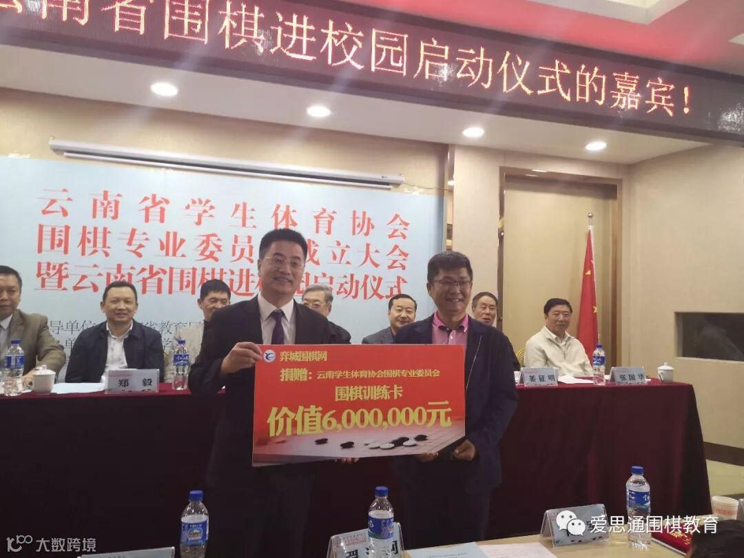 林建超主席从围棋与国家的高度发表感言后,会议进入捐赠仪式:首先由云南围棋厂厂长罗玲女士赞助委员会价值200万元的云子棋具,接下来由弈城围棋网CEO赞助价值600万元的爱思通学习卡用于训练。