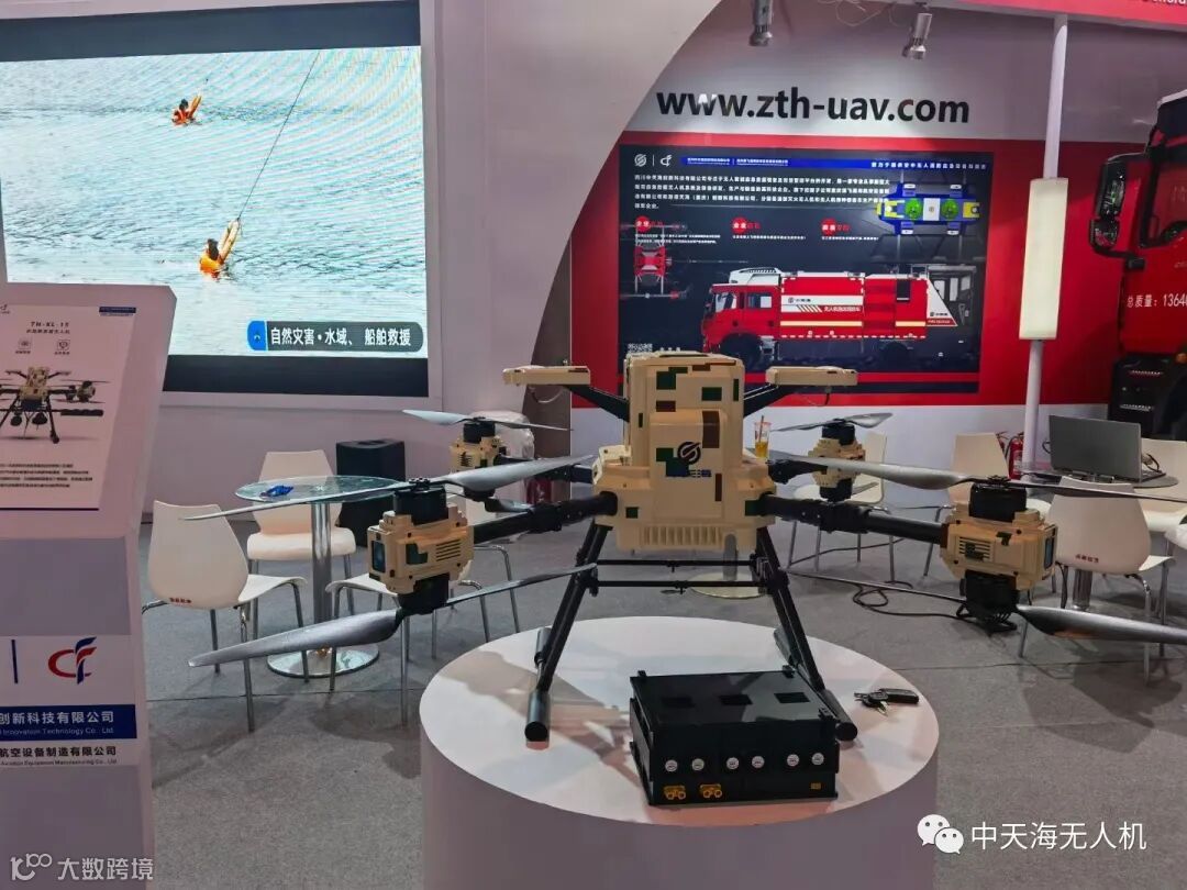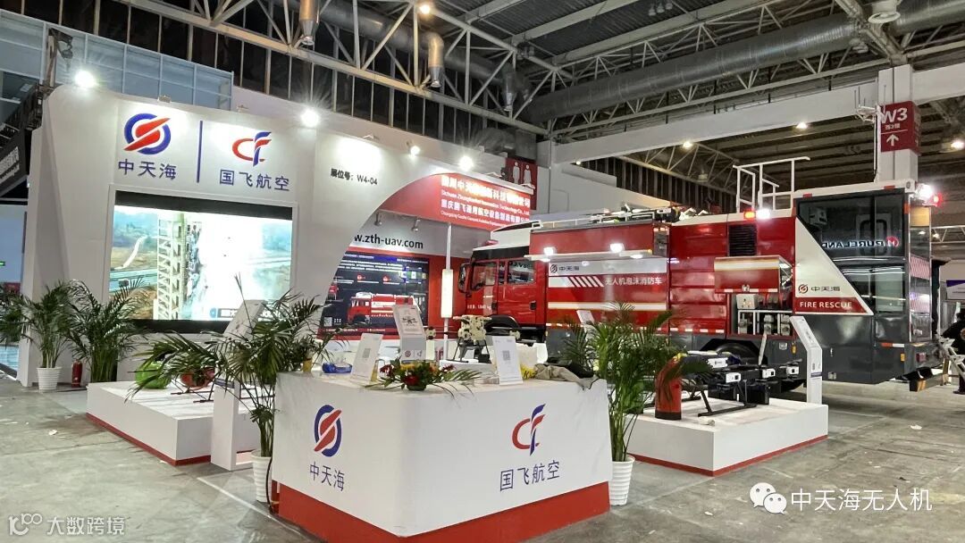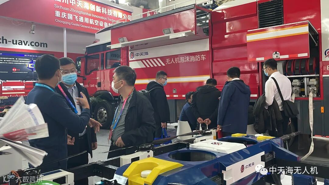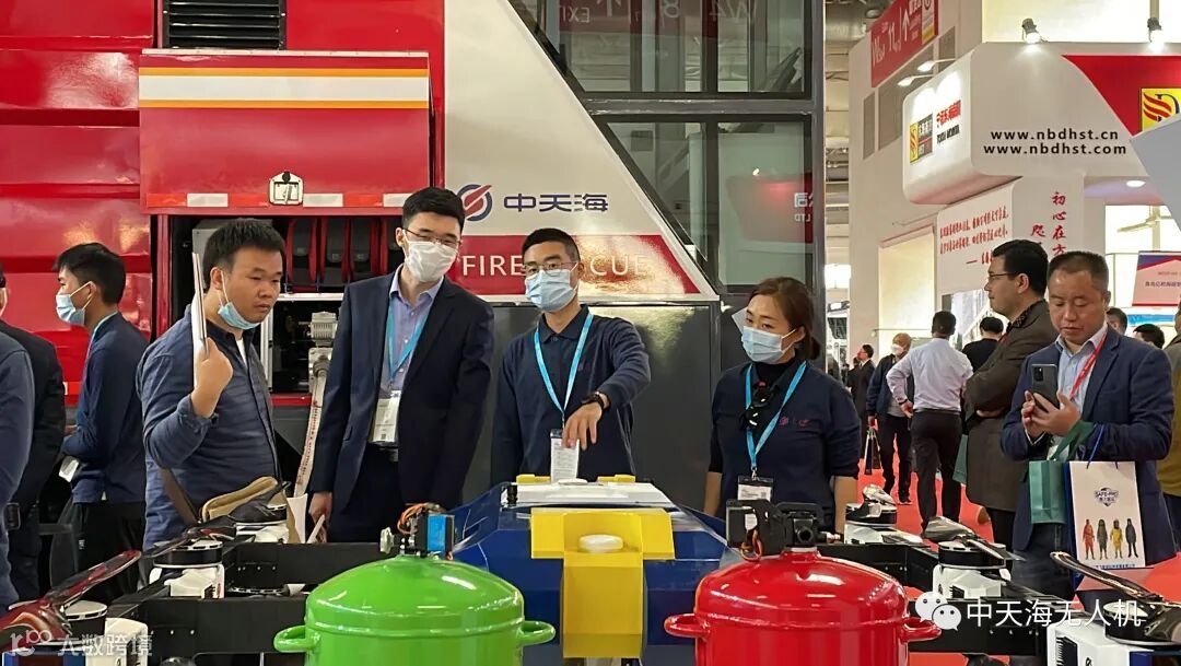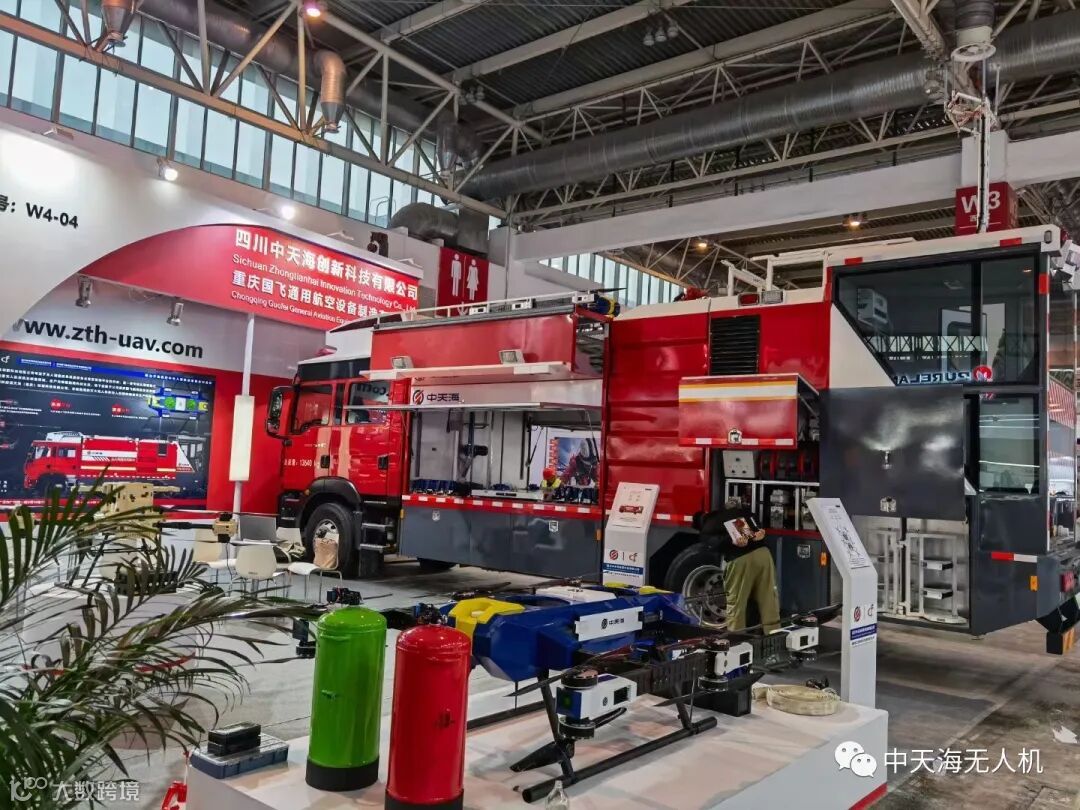 本次消防展会中天海与国飞航空携带了TH-XL-15型多旋翼系留无人机、TH-MH-30型灭火救援无人机、TH-MJ-50Ⅰ型灭火救援无人机及TH-XFC-50Ⅰ型无人机泡沫消防车等新型应急救援装备。