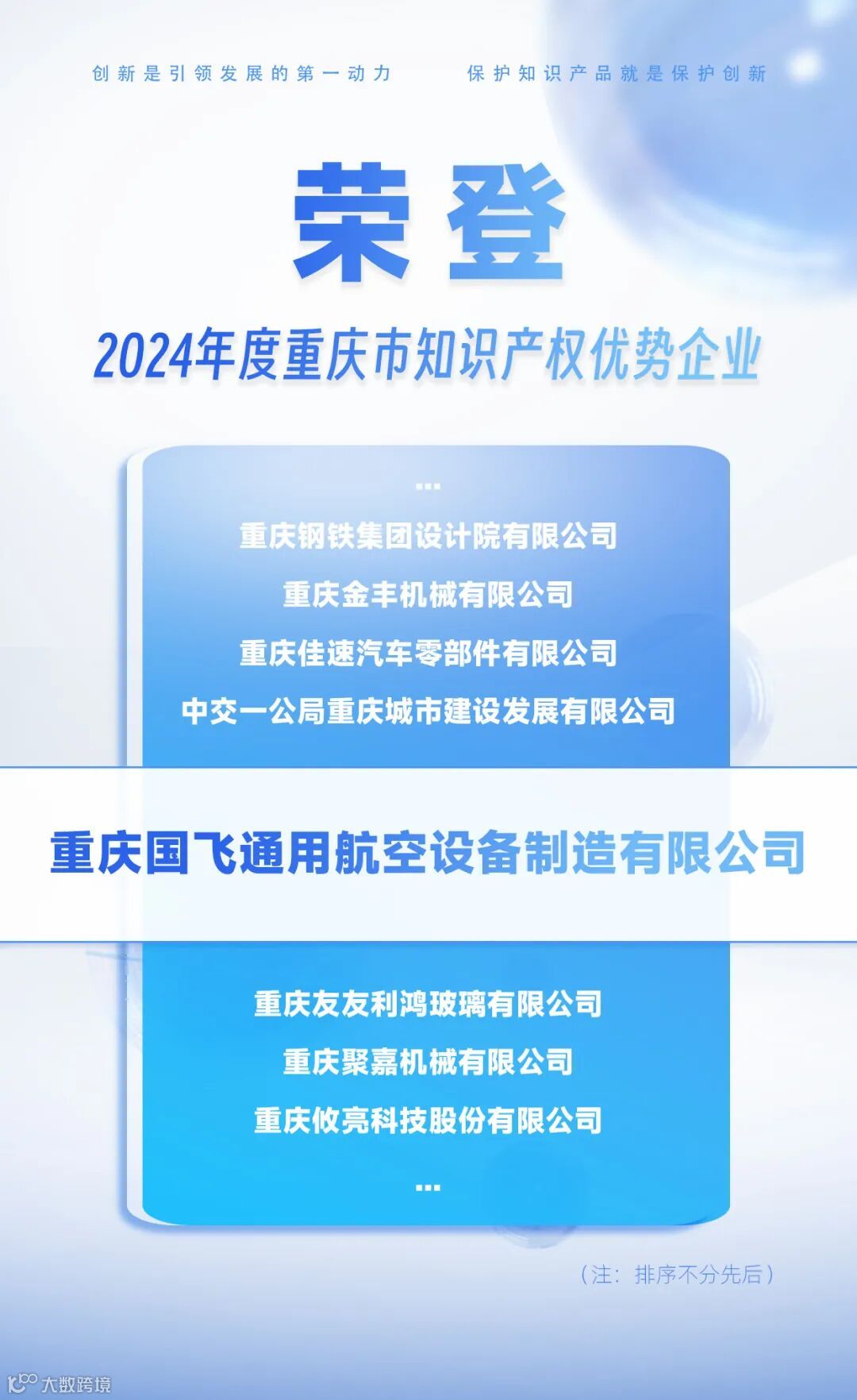 近日,重庆市知识产权局发布了《关于2024年度重庆市知识产权优势企业拟评定名单的公示》,重庆国飞通用航空设备制造有限公司,凭借在知识产权管理与创新方面的卓越表现,荣幸入选此份名单。