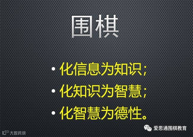 围棋教育,我们的总体目的在于,化信息为知识,化知识为智慧,化智慧为德性,让我们的人生过得更有品质,这是我想向大家做的表述。
