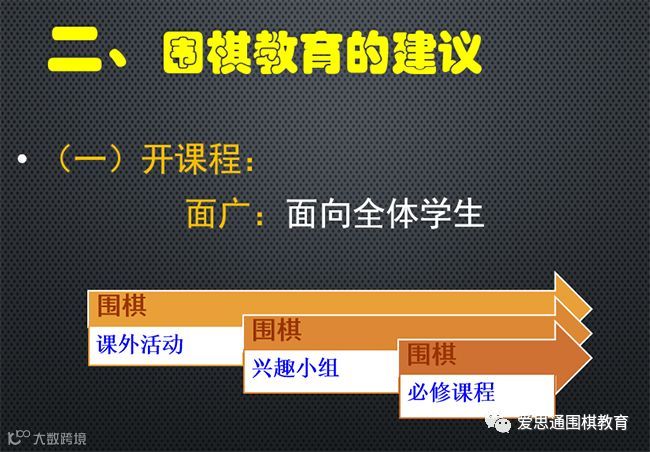 具体从围棋教育的建议来说,第一是“开课程”。开课程要面向全体学生。在我的经验里,有些学校是把它当做课外活动,有些学校是把它当做兴趣小组,很少有学校把它当做必修的课程。