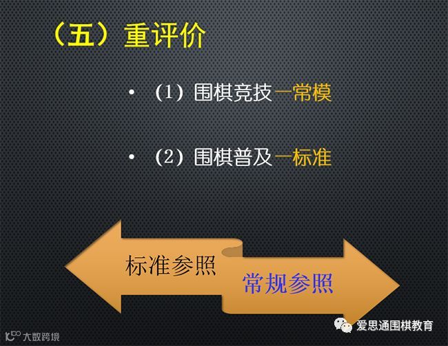 那么,围棋长期以来是一种竞技游戏,主要是常模参照,这是不可避免的,比赛嘛,要有输赢有名次。但是,对围棋教育来说,仅仅靠常模参照,不足以促进围棋教育的发展。因此,围棋的普及,要采取标准参照。要开发出一系列的标准,通过大数据的方式,来评价学生在某一个维度上处于什么水平。