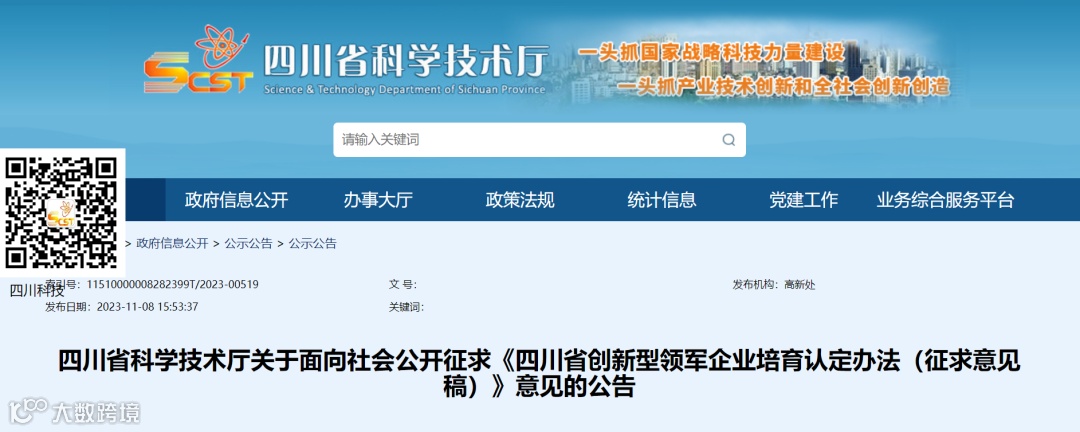 为贯彻落实省委十二届三次全会精神,纵深推进创新驱动引领产业发展,强化企业科技创新主体地位,加快培育一批科技创新能力强、能够支撑国家重大战略需求、引领未来科技变革方向、参与国际竞争合作的四川省创新型领军企业,科技厅研究起草了《四川省创新型领军企业培育认定办法(征求意见稿)》,现征求社会公众意见,欢迎社会公众积极参与,征求意见时间为2023年11月8日至2023年12月7日,在此期间请将修改意见通过电子邮箱反馈至科技厅高新处。