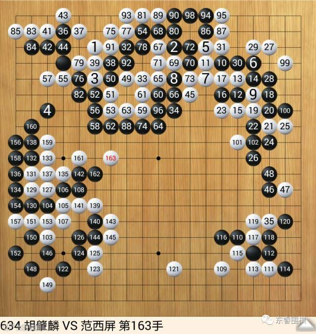 郝明霞:163枷好棋,茅塞顿开。黑往外冲,白挡,黑上冲,白挖。白弃子补断成功。我光看见当头顶,思路狭窄。郁闷啊!不如古人思路宽阔,受刺激了。