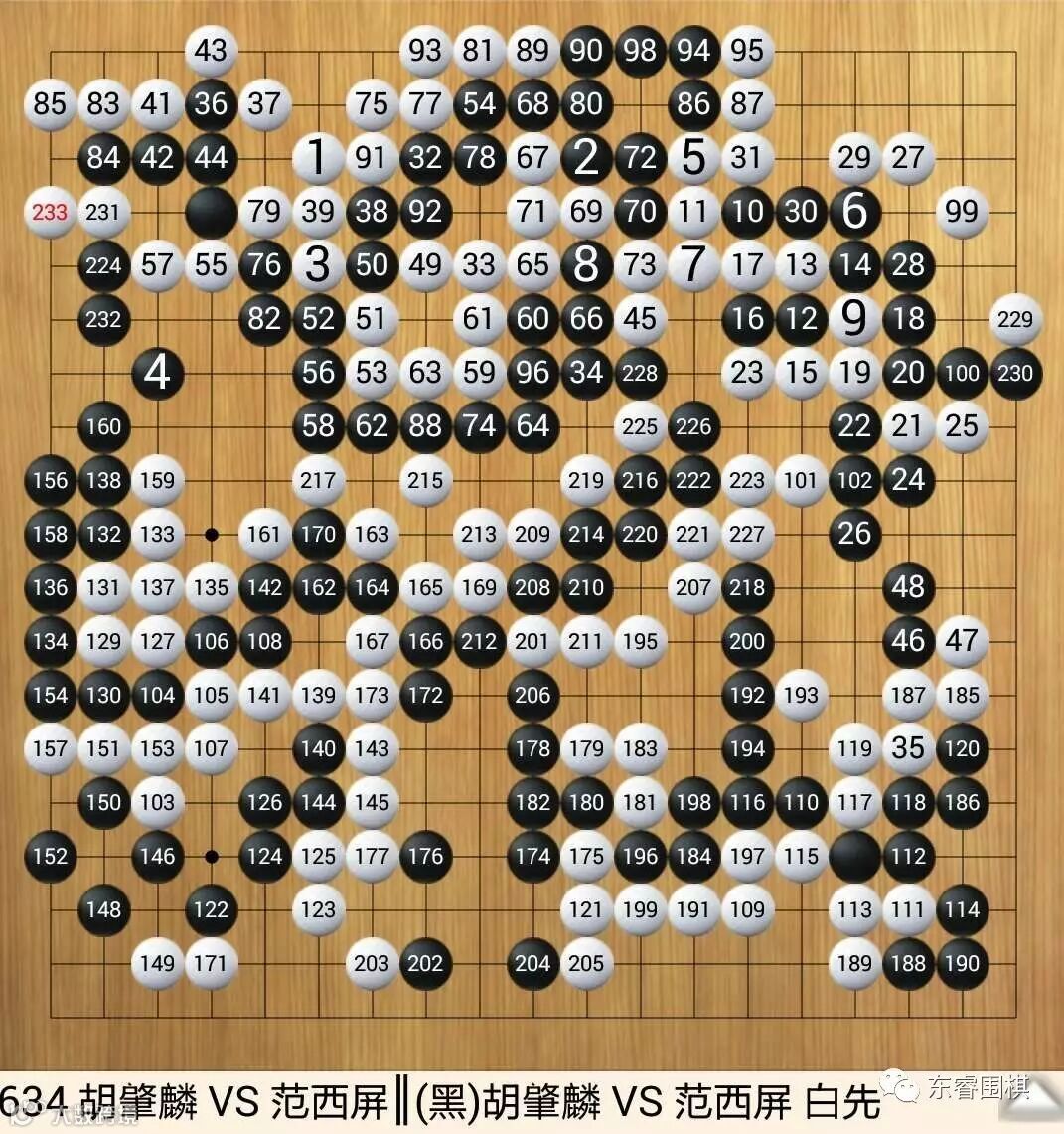 黑224回头补活,不得已。白大胜的局面下,229的小便宜也不丢下,颇有戏谑的意味。白231挖、233立,盘上再无纠纷之处,黑只得黯然投子。