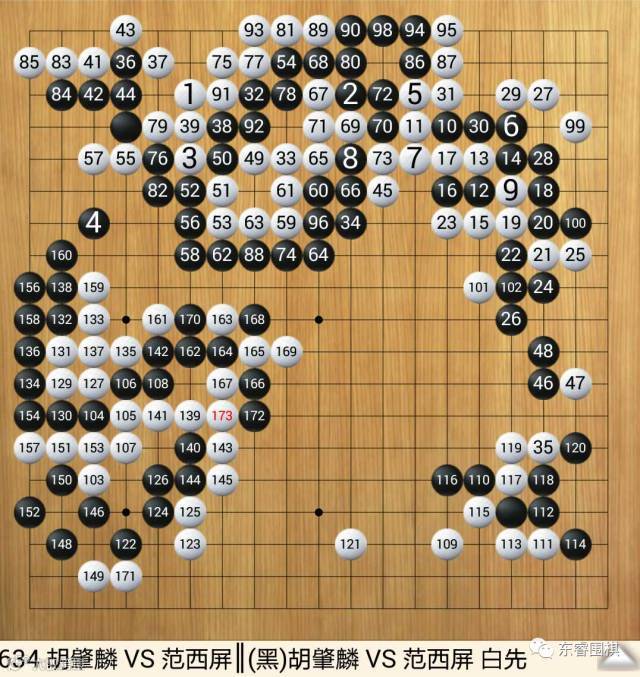 陈祖德:这个结果是难以想象的。当初黑棋小目挂,白一间紧逼,都是正常的进行,但谁曾想到,走了一圈,白棋却把黑角全部卷了进来。范西屏对残子利用之绝妙,不能不令人赞叹,尤其163的枷更是神来之笔。至此,黑顿时要中盘败了。